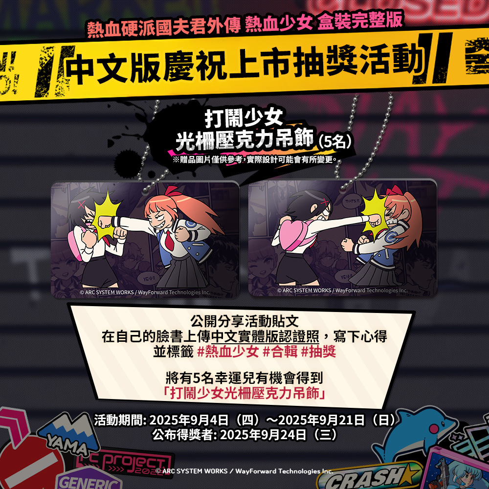 為慶祝《熱血硬派國夫外傳 熱血少女 盒裝完整版》中文版上市,從今天起舉辦抽獎活動。公開上傳實體版購買認證照並留下關於本作的感想,就有機會得到「打鬧少女光柵壓克力吊飾」。抽獎活動詳情如下。