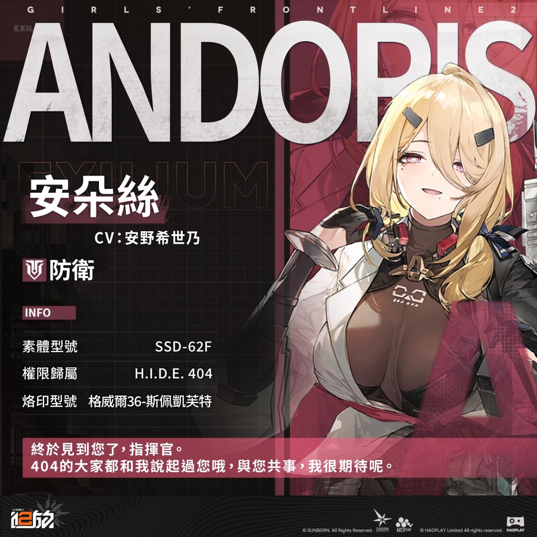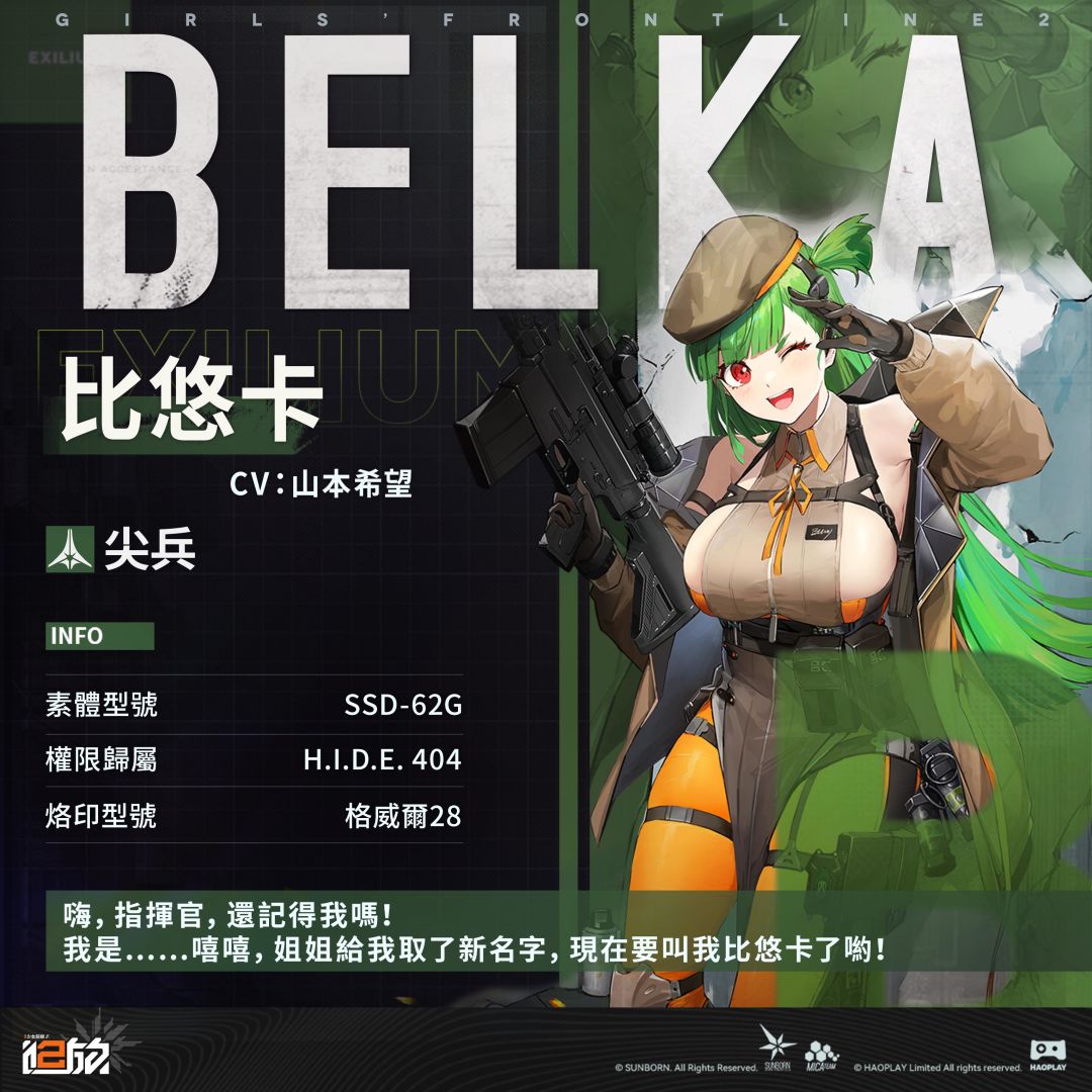 天真、活潑,無害的小心機寫在臉上。對指揮官和姐姐絕對忠誠,致力於成為人見人愛的精英人形。