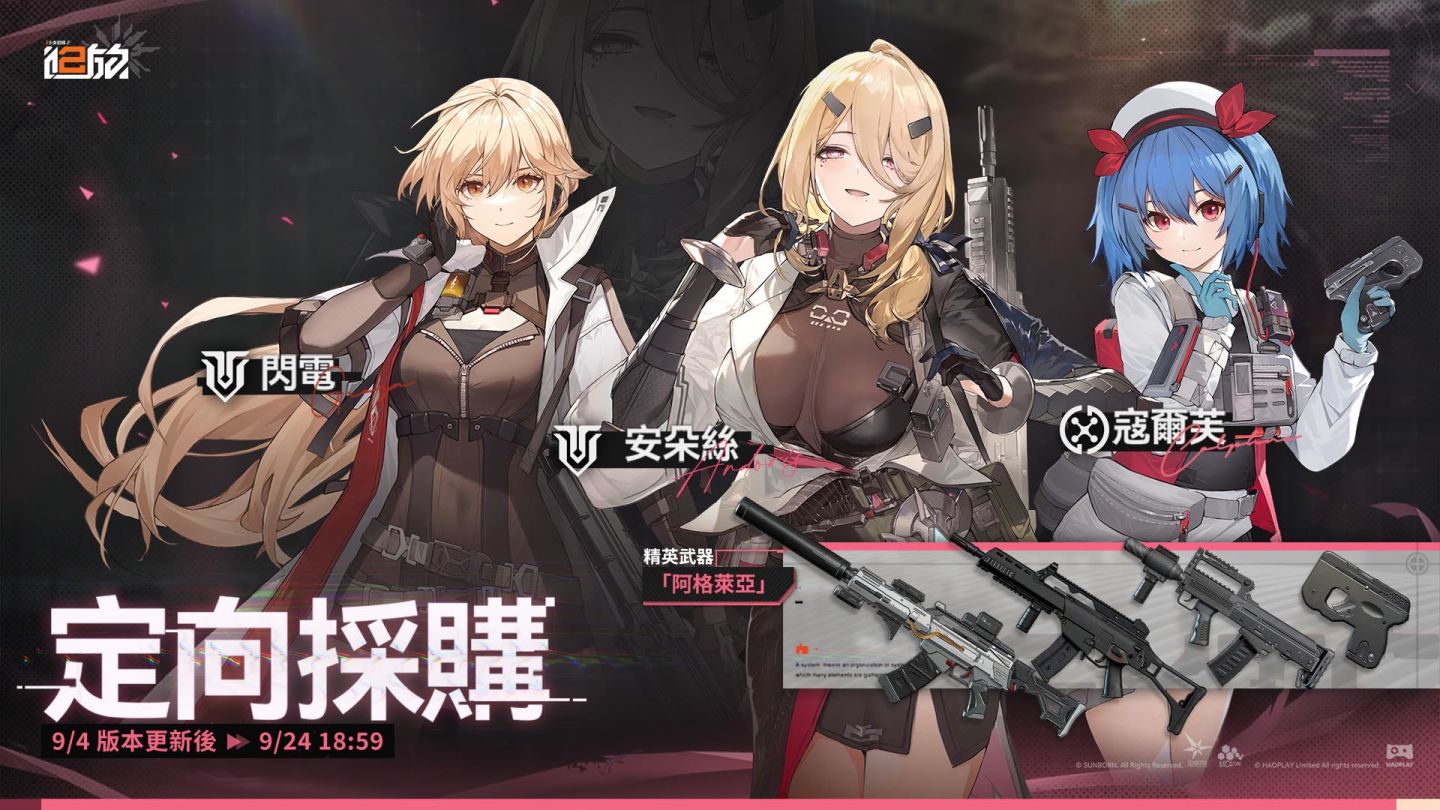 活動期間,在「定向採購」及「軍備提升」中,人形「安朵絲」、「閃電」、「寇爾芙」及精英武器「阿格萊亞」的獲取機率限時提升。