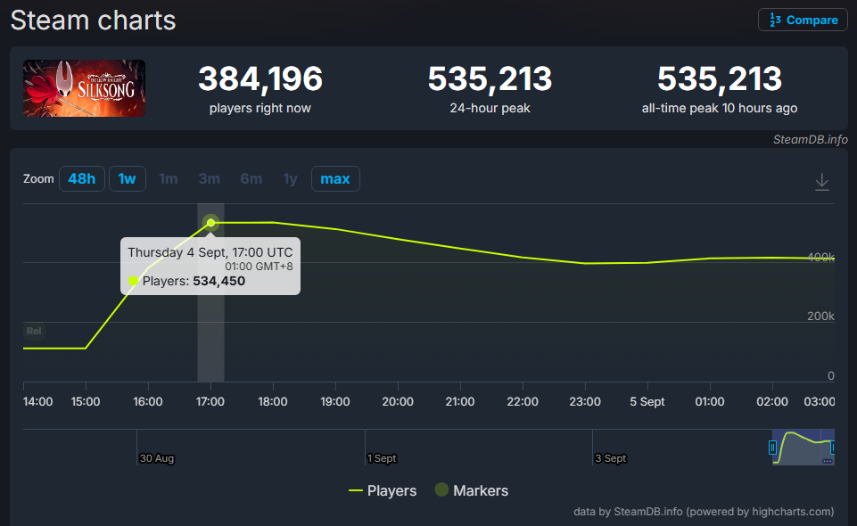 Team Cherry《空洞騎士:絲之歌》是 2D 動作冒險遊戲《空洞騎士》續作,玩家這次將隨著聖巢保護者「大黃蜂(Hornet)」,前往全新國度發現新的力量,與遊戲新增 150 種全新敵人,製作強大的工具來擴張武器庫、陷阱等。此外還有給予可鑽研的內容「絲魂」模式。由於玩家期待已久,上線 24 小時內遊戲最高同上人數達到 53 萬人,並於購買時癱瘓 Steam 平台。
