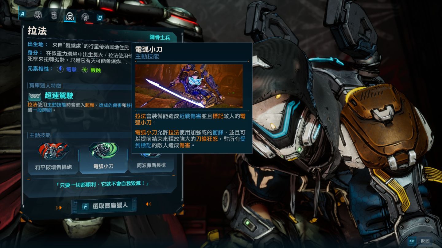 外骨骼士兵拉法,技能特徵是主動技能會標記增傷,能夠使用和平破壞者機砲、電弧小刀、阿波菲司長槍等,因此技能樹允許切換武器型態(遠程到近戰),適應多變戰場。