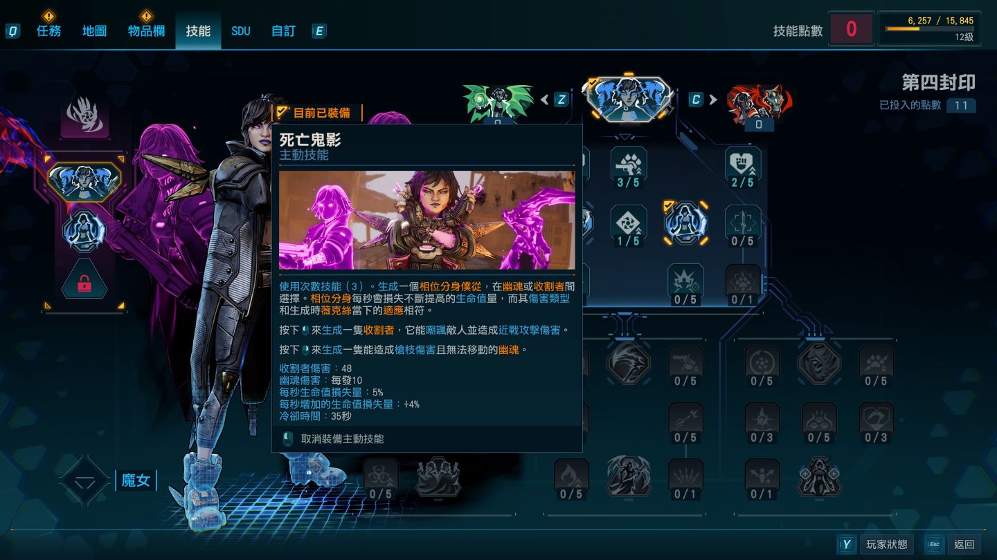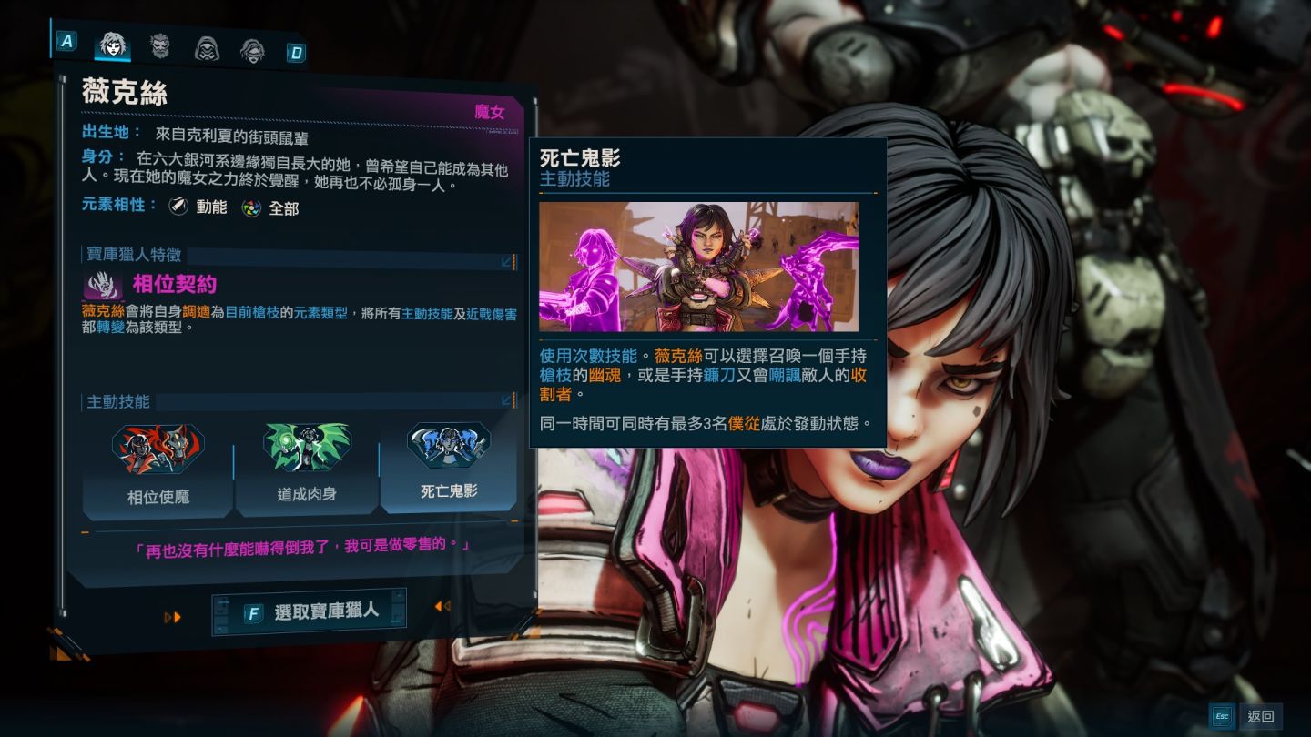 薇克絲能夠召喚的分身可以隨戰況變換,一種是手持槍械的「幽魂」等同有支援火力存在而且不需要引導瞄準,另一種則是揮舞鐮刀擊倒並嘲諷敵人的「收割者」。這代表即使在主動技能的冷卻期間,玩家依然能透過分身獲得火力支援,並專注於槍械本身的射擊樂趣。或者利用收割者來坦住較為強大的敵人,隨著技能樹投資下去,分身爆炸或者是吸取生命的玩法都可以實現。