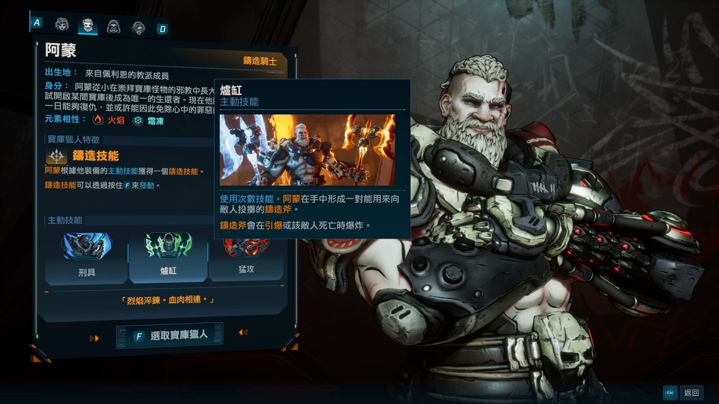鑄造騎士阿蒙,主動技能「刑具、爐缸、猛攻」,特能使出戰斧與護盾,技能樹增強近戰傷害、防禦或隊友支援,適合坦克型肉搏玩家。