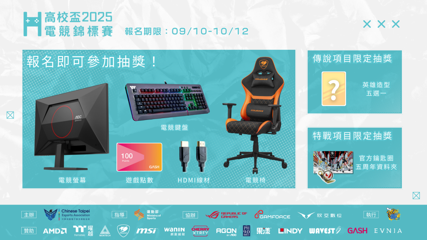 「高校盃電競錦標賽」9 月正式開放報名!賽事獎金與獎品總價值超過 60 萬元,只要報名出賽就有機會獲得電競椅、螢幕、鍵盤、遊戲周邊及點數等多項好禮抽獎,讓你參賽還能順便升級裝備!