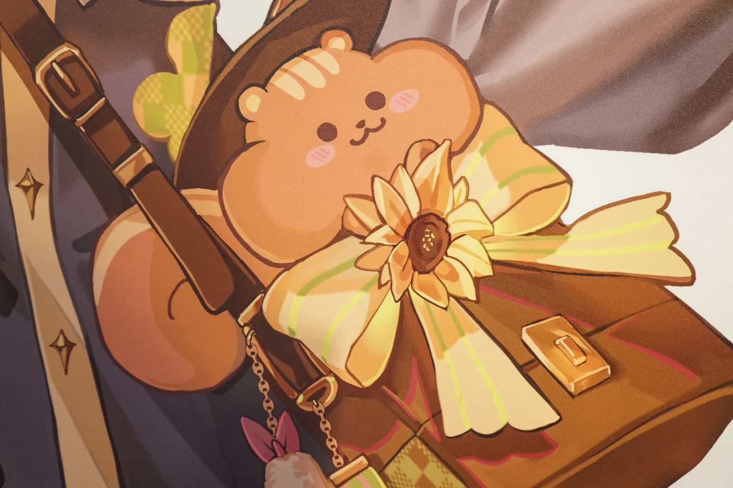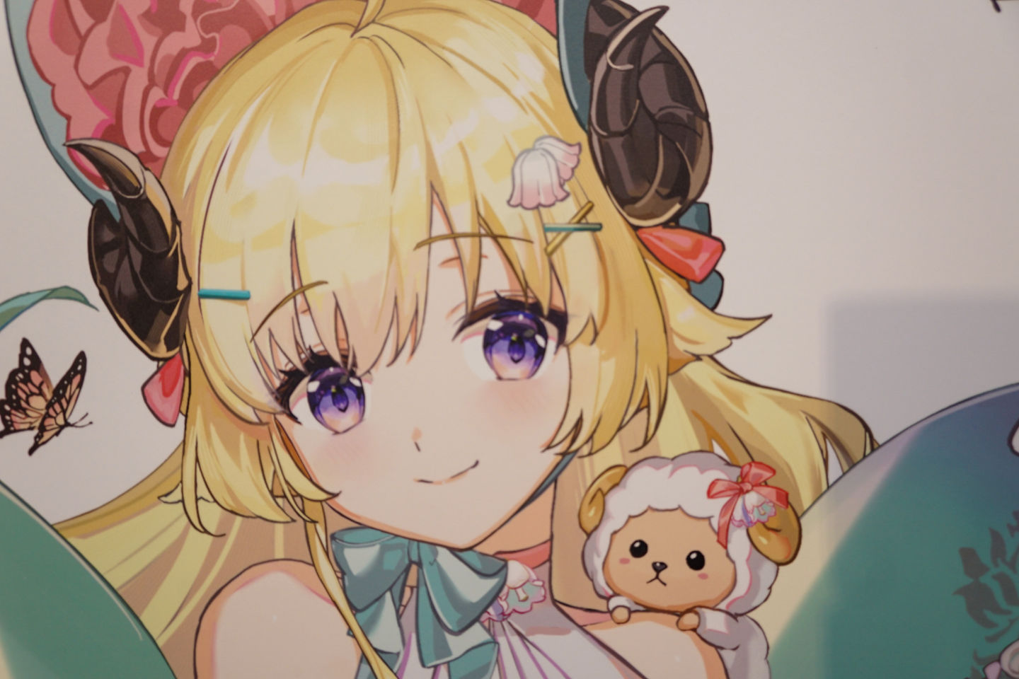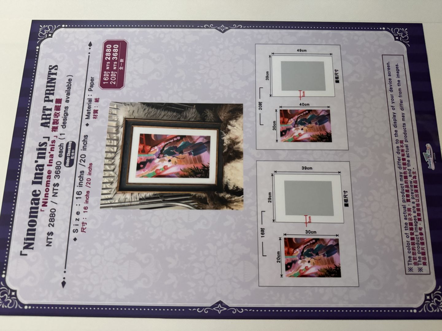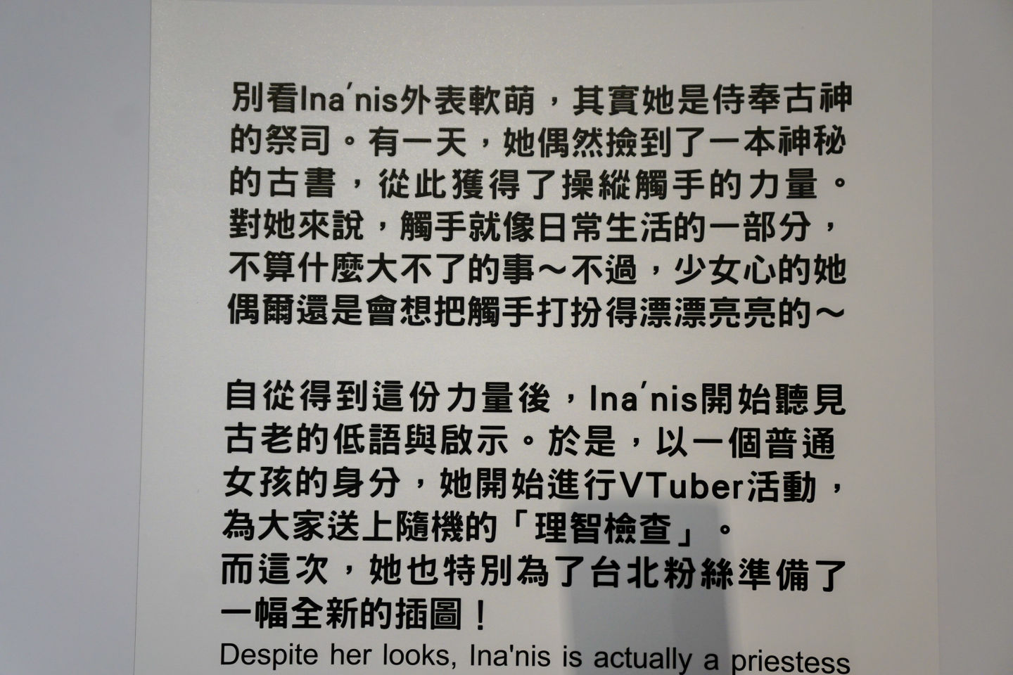 粉絲們除了能看到 VTuber Ina 親自為本次特展拍攝的問候影片,並且再三叮嚀不可拍攝開放的區域,現場每個畫作都可以留意角落中她為每幅畫作的註解。展覽除了 VTuber Ina 的畫作、複製原畫,以及她特別為台北場繪製,據悉是上週五才開始,剛出爐的熱騰騰畫作,是以九份風景作為主題的特別圖繪,現場也可以讓粉絲預購複製畫收藏。