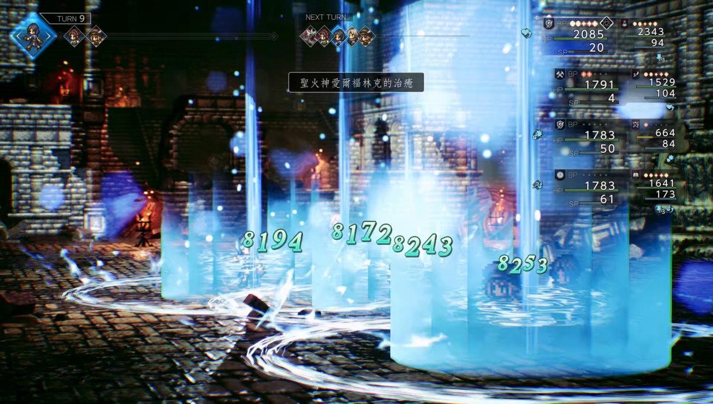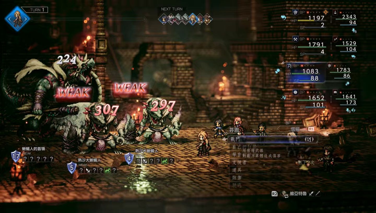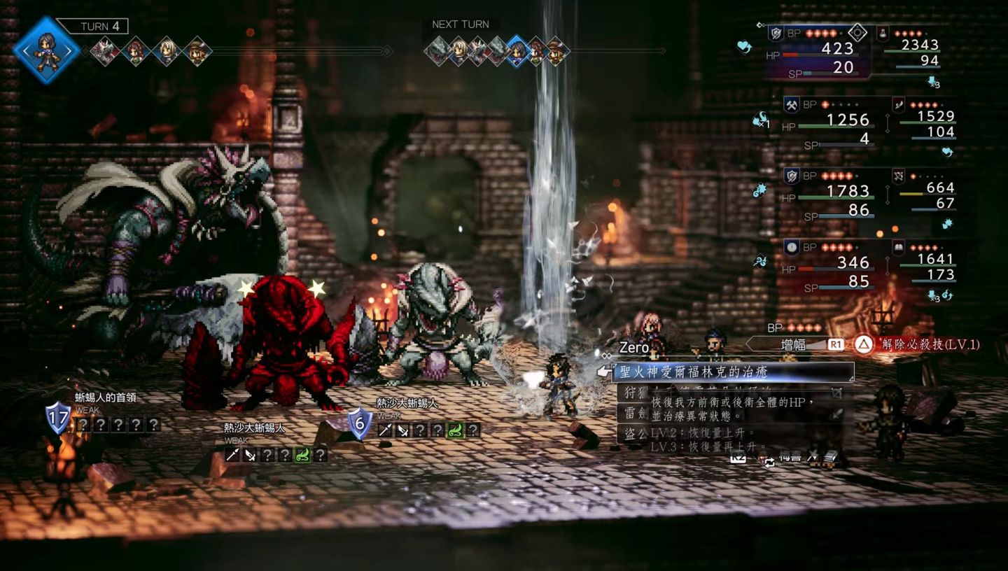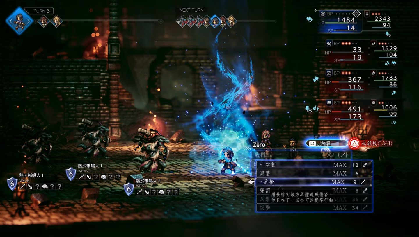 由於是《歧路旅人》系列繼承要素的作品,戰鬥技能上自然還是以識破敵人弱點,增幅加強打擊破防效果的方式進行,但試玩中的敵人依然強橫,動不動就來個打到前衛趴地,即使有著前後衛交換的方式,還是相當有挑戰性。