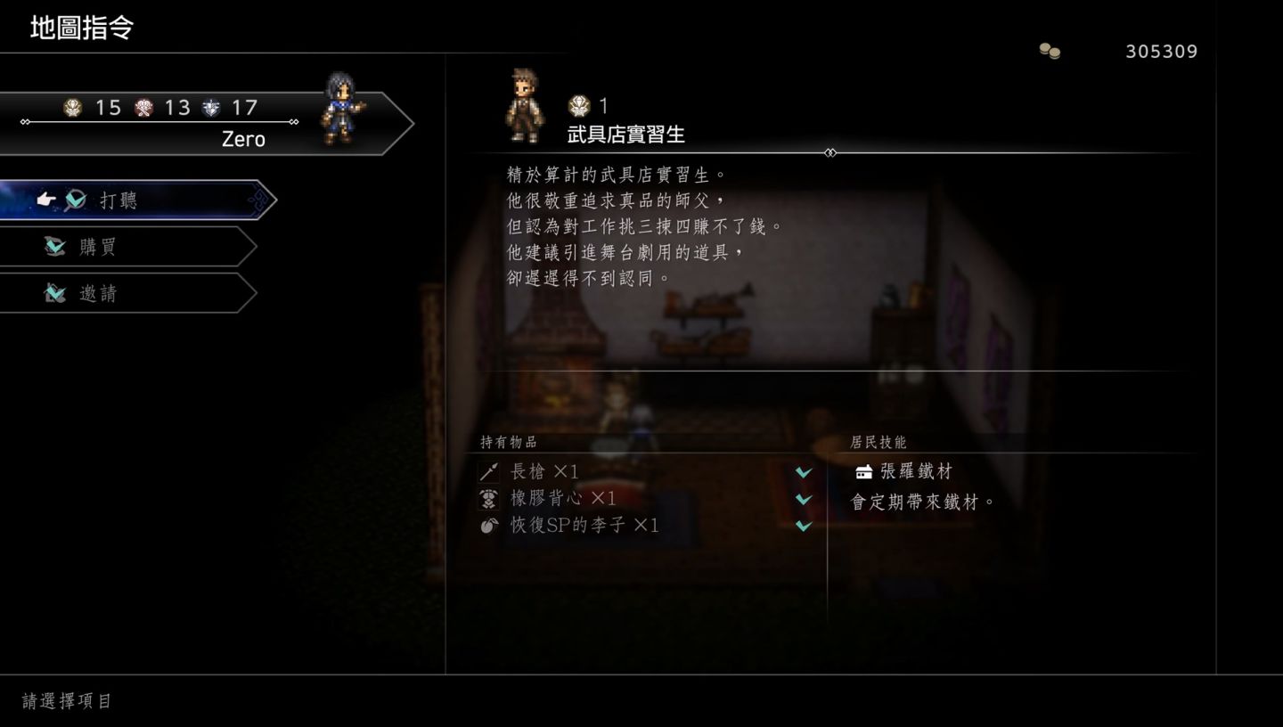 鈴木裕人:商店核心是為了增加「便利性」。以前,為了買特定的道具,你可能需要跑遍很多不同的城鎮,有時會覺得有點麻煩。在《0》裡面,你可以透過地圖指令獲得其他城鎮的「商品情報」,只要把情報帶回自己的城鎮,你就能在自己的商店裡買到那個城鎮的商品了。此外,商店裡還會有一個「交易品」系統,會隨機上架一些商品,有時甚至會出現非常強力的稀有道具,這會讓每次回到城鎮都充滿期待。