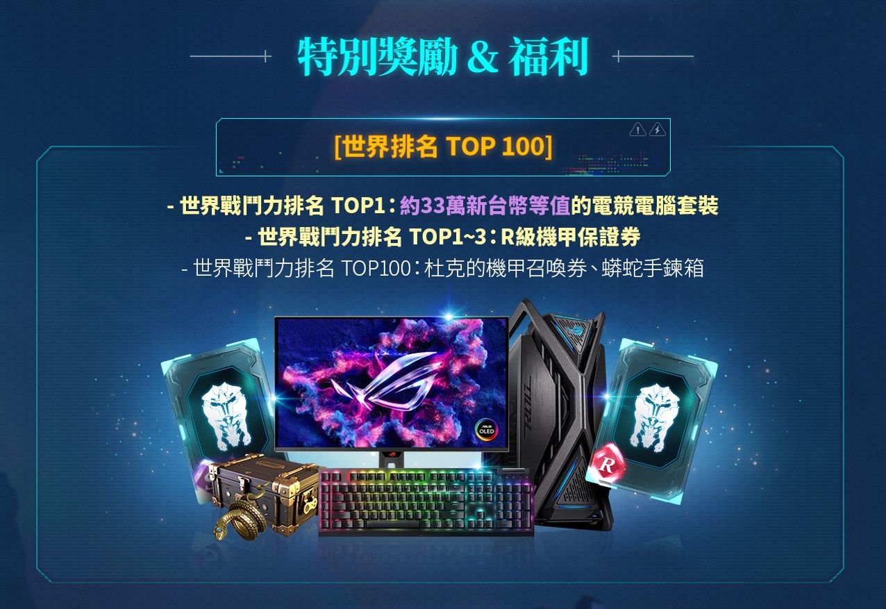 官方同時在開服期間至 10/12 止,舉辦高價值獎品的「個人排名活動」與「最強公會活動」,達到世界第 1 名的守護者將有可獲得價值 33 萬新台幣的電競電腦套裝!前三名將獲得「R級機甲保證券」!戰力排名第一的公會全員將可獲得「杜克的 11 次選擇召喚券×10」等獎勵!