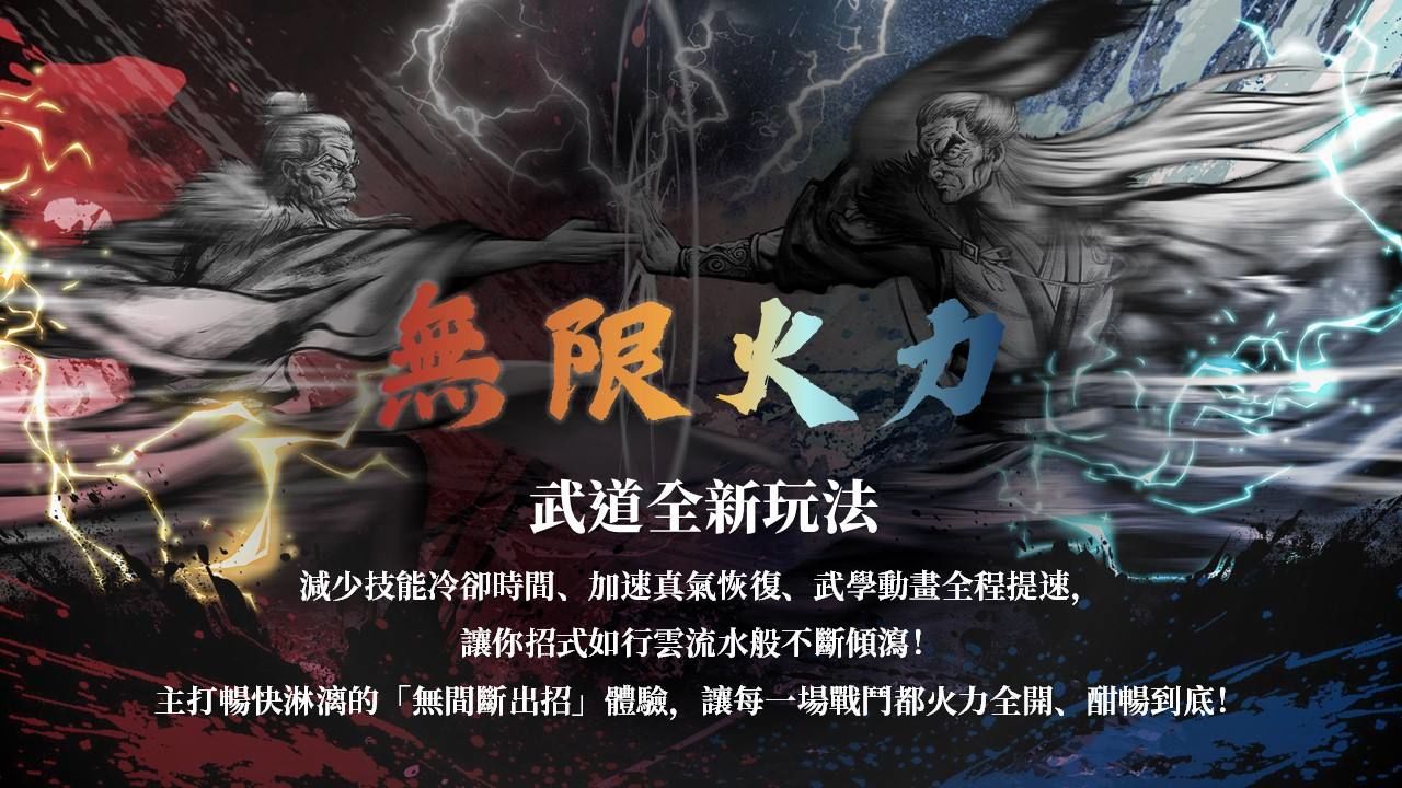 武道全新玩法—無限火力將於 9 月 25 日正式啟動!在全新玩法中,技能冷卻時間將減少,並加速真氣恢復,武學動畫全程提高速度,讓你的武學招式如行雲流水般不斷傾瀉而出!武學動畫全程提高速度,讓你的武學招式如行雲流水般不斷傾瀉而出!主打暢快淋漓的「無間斷出招」體驗,讓每一場戰鬥都火力全開,酣暢到底!