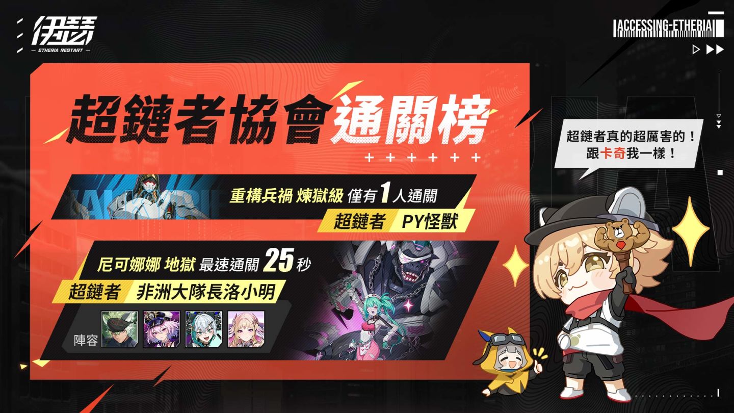 「超鏈者協會」在本次釋出的通關榜顯示,在重構兵禍煉獄關卡中,最終僅有「PY 怪獸」成功通關,展現出非凡的實力與毅力,令人讚嘆。而在玩家最喜愛挑戰的尼可娜娜地獄關卡中,「非洲大隊長洛小明」憑藉莉拉姆與諦聽的強力輸出,搭配上克洛斯及芙蕾雅特有的 Debuff 效果,創下最快通關紀錄,全程僅耗時 25 秒,刷新測試期間的最佳成績。