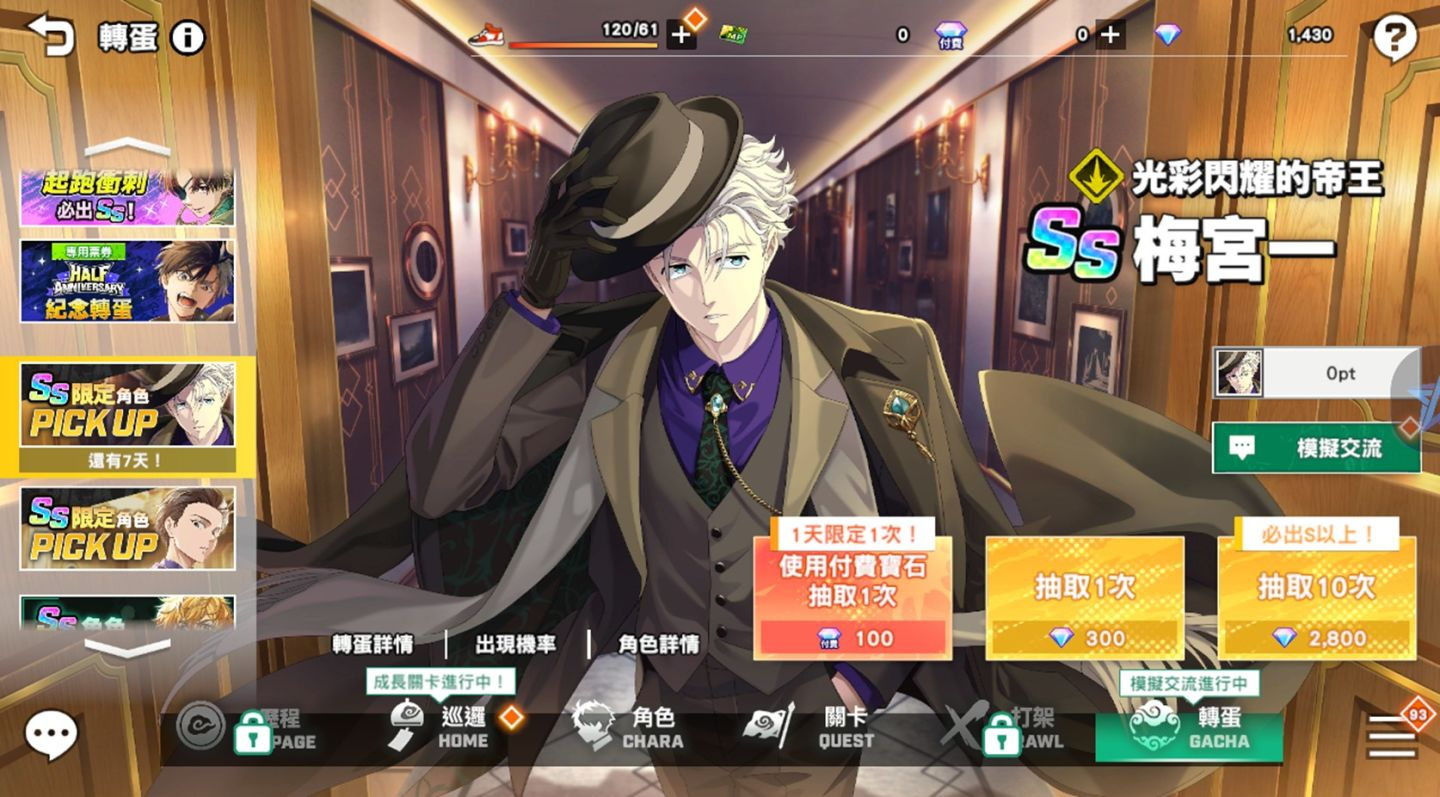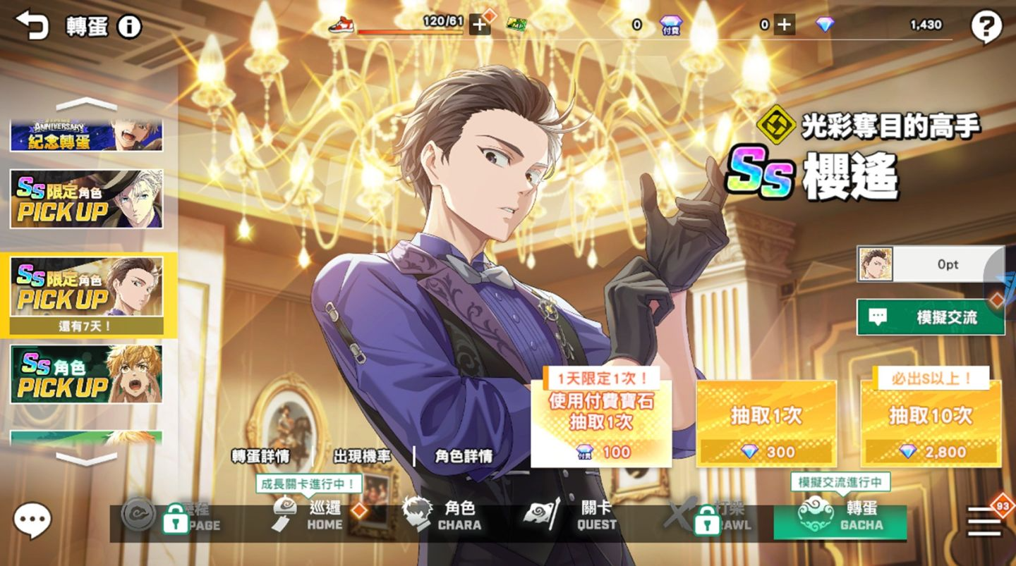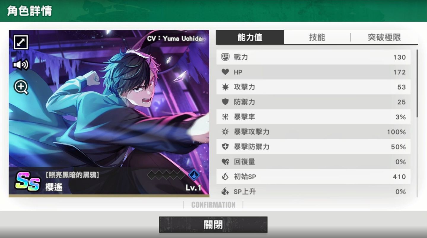畢竟本質還是一款抽卡遊戲,能夠在開服挖到多少石對新手也很重要。剛入坑的粉絲可剛好趕上紀念活動「高尚的對決~頂點挑戰者」。活動還蠻有誠意的,每天登入最多能拿到 1500 鑽石,到 9 月 26 號結束,想玩的別錯過。目前卡池中最受關注的,當然是限定角「[光彩奪目的高手 / 櫻遙」,還有剛更新的 SS 級角色「照亮黑暗的黑鴉 / 櫻遙」,遊戲版的賣點,就是在動畫中的那些角色可以有更帥氣的樣貌登場。