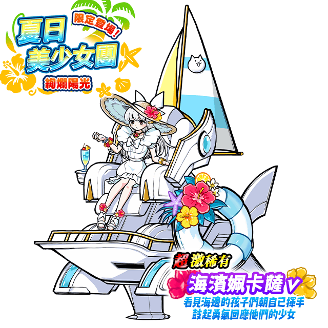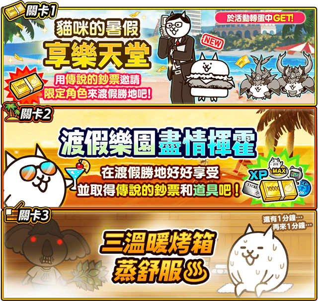 活動首日起開放關卡「貓咪的暑假 享樂天堂」,活動第 5 天起則會追加在私人海灘戰鬥的關卡「渡假樂園盡情揮霍」!通過以上關卡就有機會獲得「傳說的鈔票」,能用來轉期間限定活動轉蛋「貓咪的暑假 享樂天堂篇」喔!
