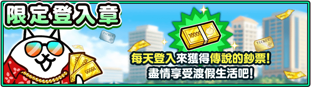 只要在活動期間內登入遊戲,每天都可以獲得 1 個登入章!可以獲得「傳說的鈔票」、「稀有券」等道具,記得天天來玩遊戲!