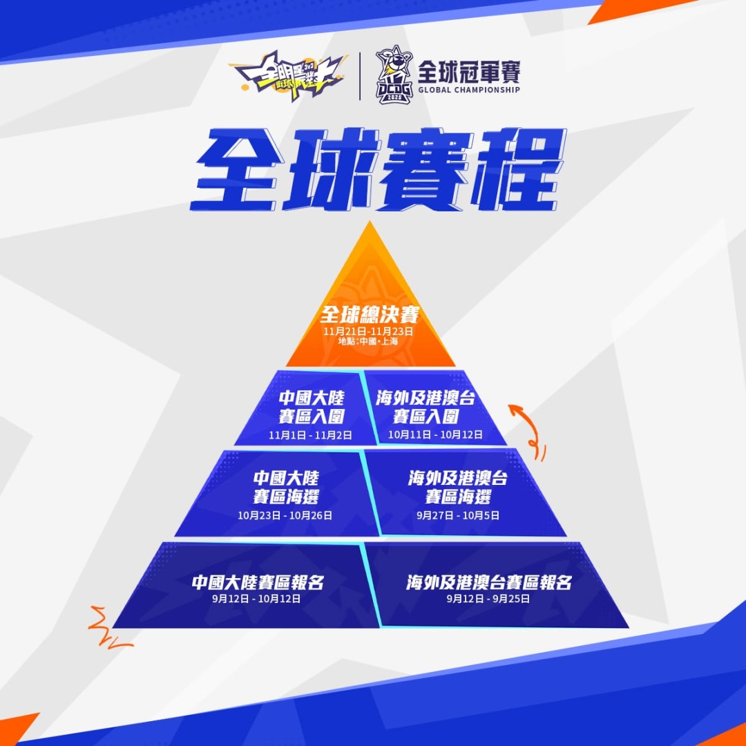 港澳台賽區選拔賽自 9/12 起正式開放報名!賽事採用兩階段制:第一階段「海選賽」32 支隊伍分為 8 組進行 BO3 單淘汰制,各組取 1 支隊伍晉級。第二階段「入圍賽」8 支晉級隊伍將展開最終決戰,爭奪唯一的總決賽席位,勝出隊伍將代表港澳台賽區挺進上海,挑戰世界舞台的終極榮譽!