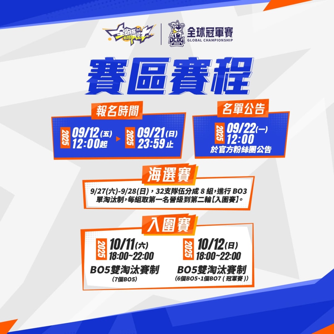 1. 海選賽:BO3 單淘汰制,分為 8 小組,每小組取 1 名晉級「入圍賽」。 2025/09/27(六):1 ~ 4 組,18:00~22:00,共 16 支隊伍,分為 4 小組。 2025/09/28(日):5 ~ 8 組,18:00~22:00,共 16 支隊伍,分為 4 小組。 2. 入圍賽:BO5 雙敗淘汰賽制 2025/10/11(六)18:00~22:00:BO5 雙淘汰制(7 場 BO5) 2025/10/12(日)18:00~22:00:BO5 雙淘汰制(6 場 BO5 + 1 場 BO7 冠軍賽) |