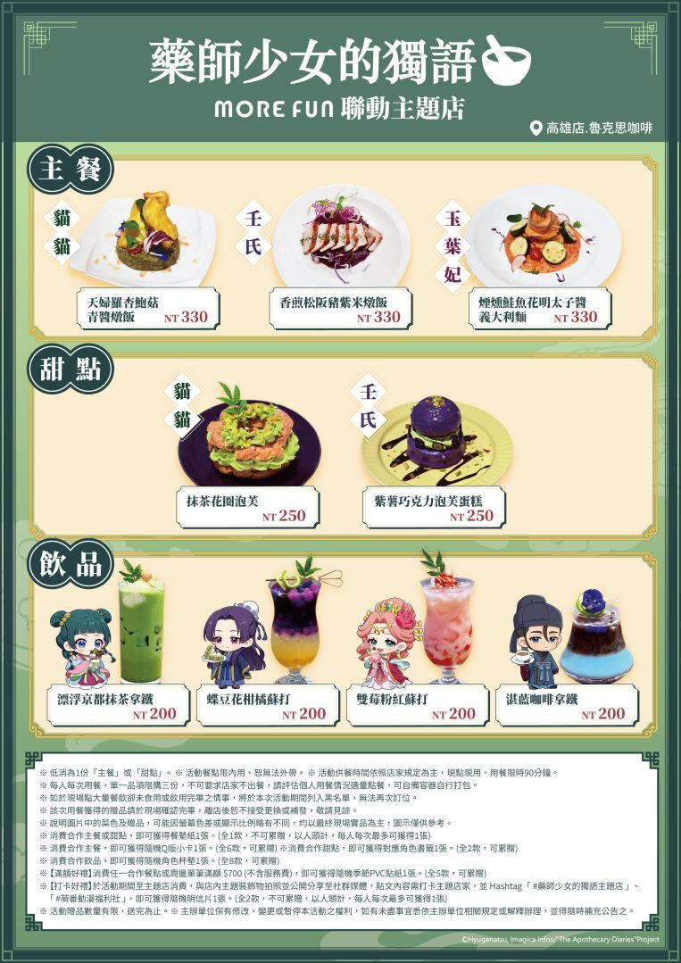 去年首次聯動活動廣受好評,讓眾多粉絲紛紛敲碗期待。本次回歸的主題店不僅延續人氣特典,更特別繪製了全新「Q版喫茶店系列」角色圖素,包含貓貓、壬氏、玉葉妃、高順四位人氣角色,將用於隨餐附贈特典、周邊商品等設計。無論收藏或打卡,都能讓粉絲與角色們創造專屬回憶。