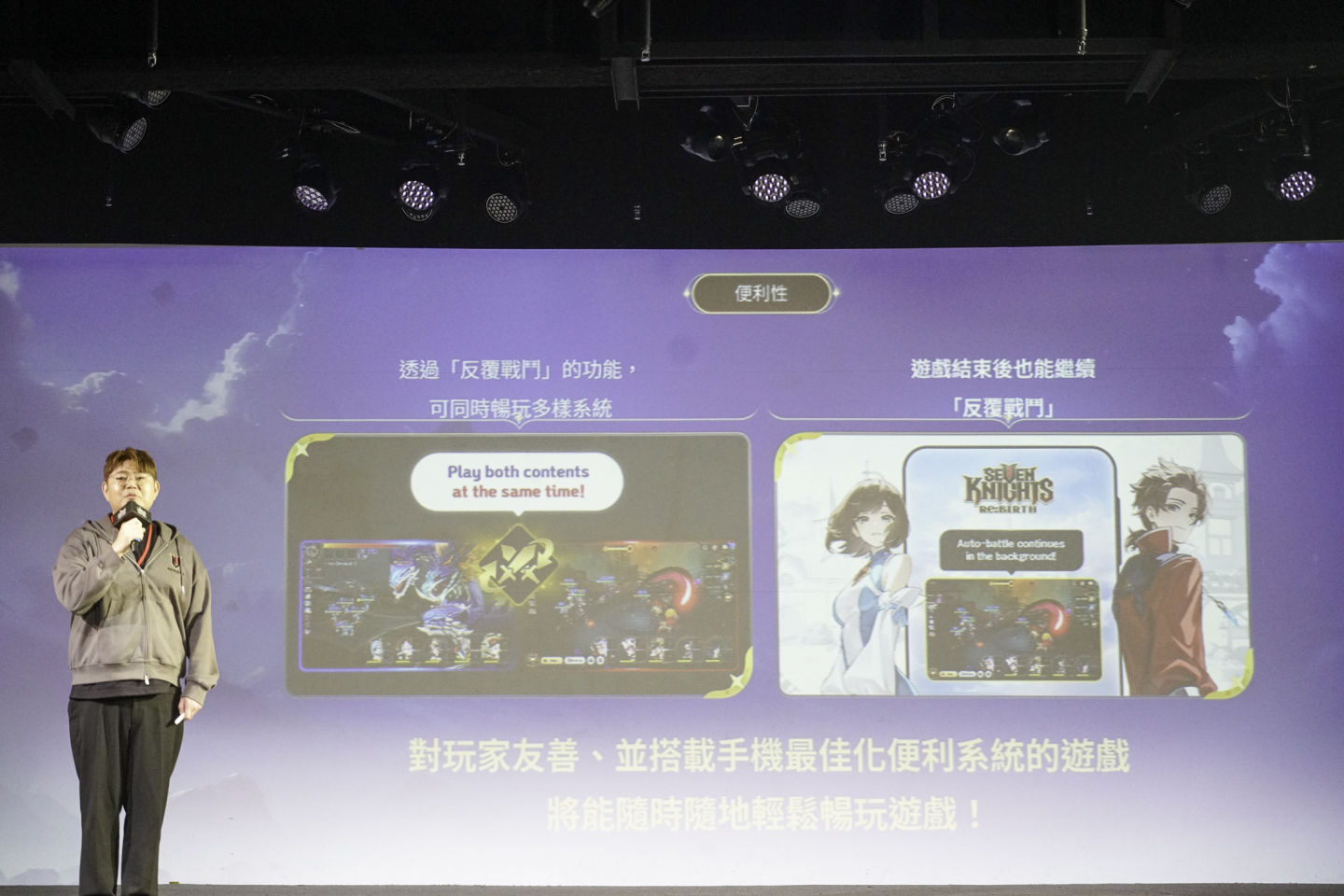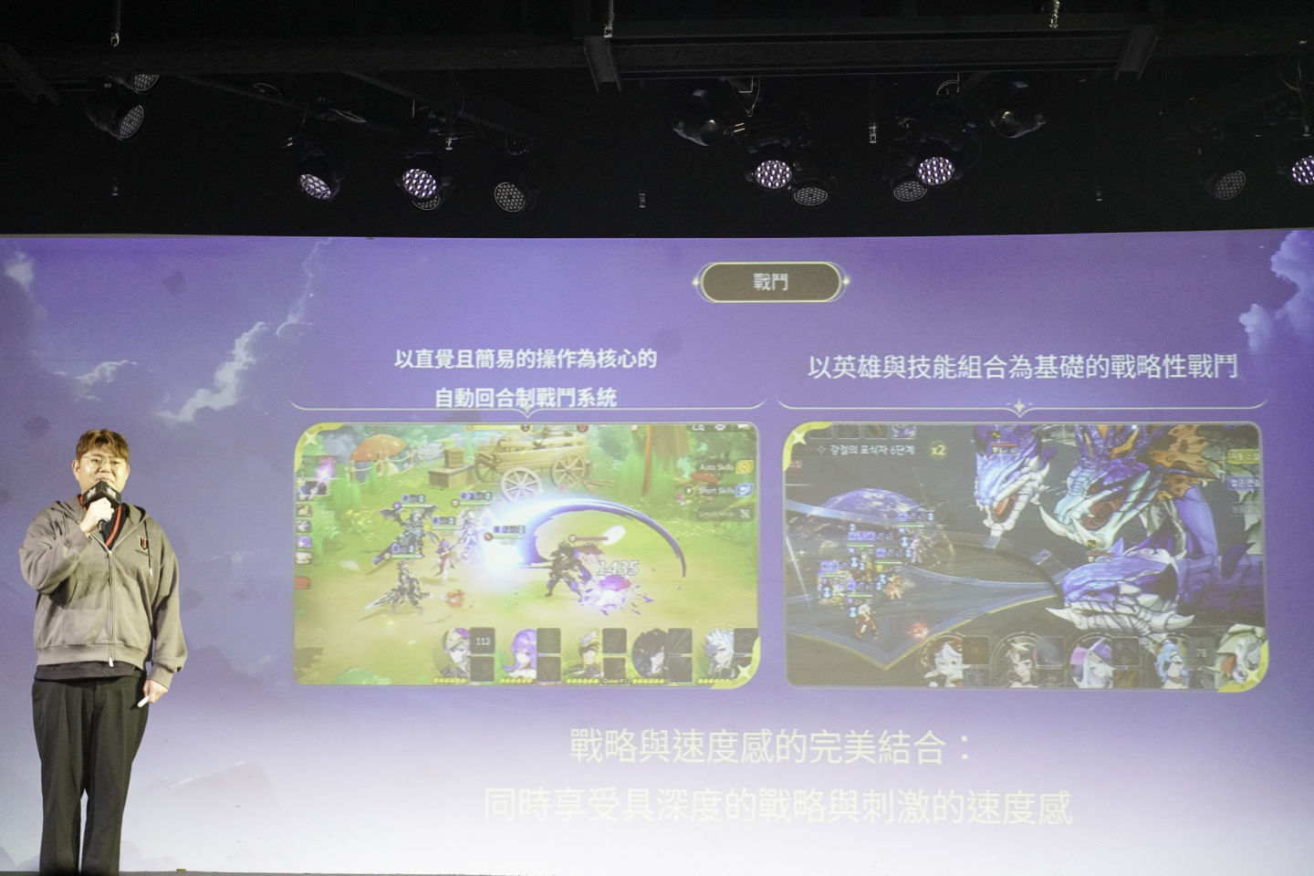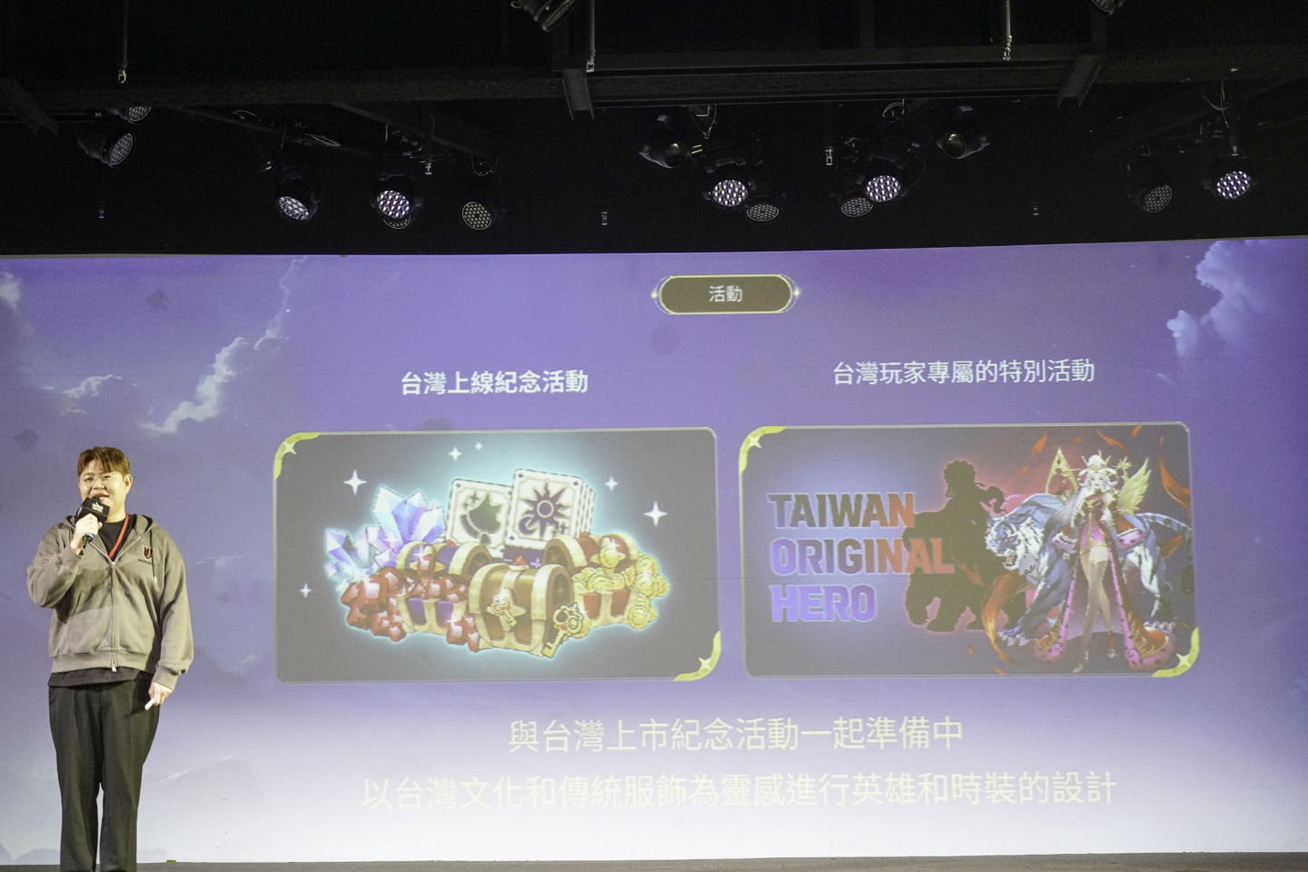 最後則是獎勵架構,遊戲打造了對玩家友善的獎勵機制,玩家透過遊玩本身就能持續獲得遊戲內的付費貨幣「紅寶石」,並可透過合成系統獲得高階英雄,減輕玩家的課金負擔。金代表同時預告,未來將會推出專為台灣設計的紀念英雄,剪影已在簡報中亮相。