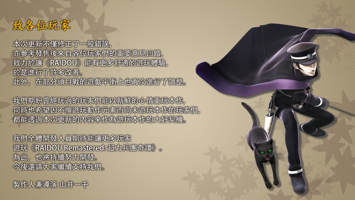 SEGA 世雅宣布,好評發售中的 Atlus RPG《RAIDOU Remastered:超力兵團奇譚》,以新增、調整遊戲內部分機制為中心的更新資料 Ver.1.10正式開始發布。釋出更新的同時,也一併公開本作製作人兼導演的山井一千先生要傳達給玩家們的製作人信件。