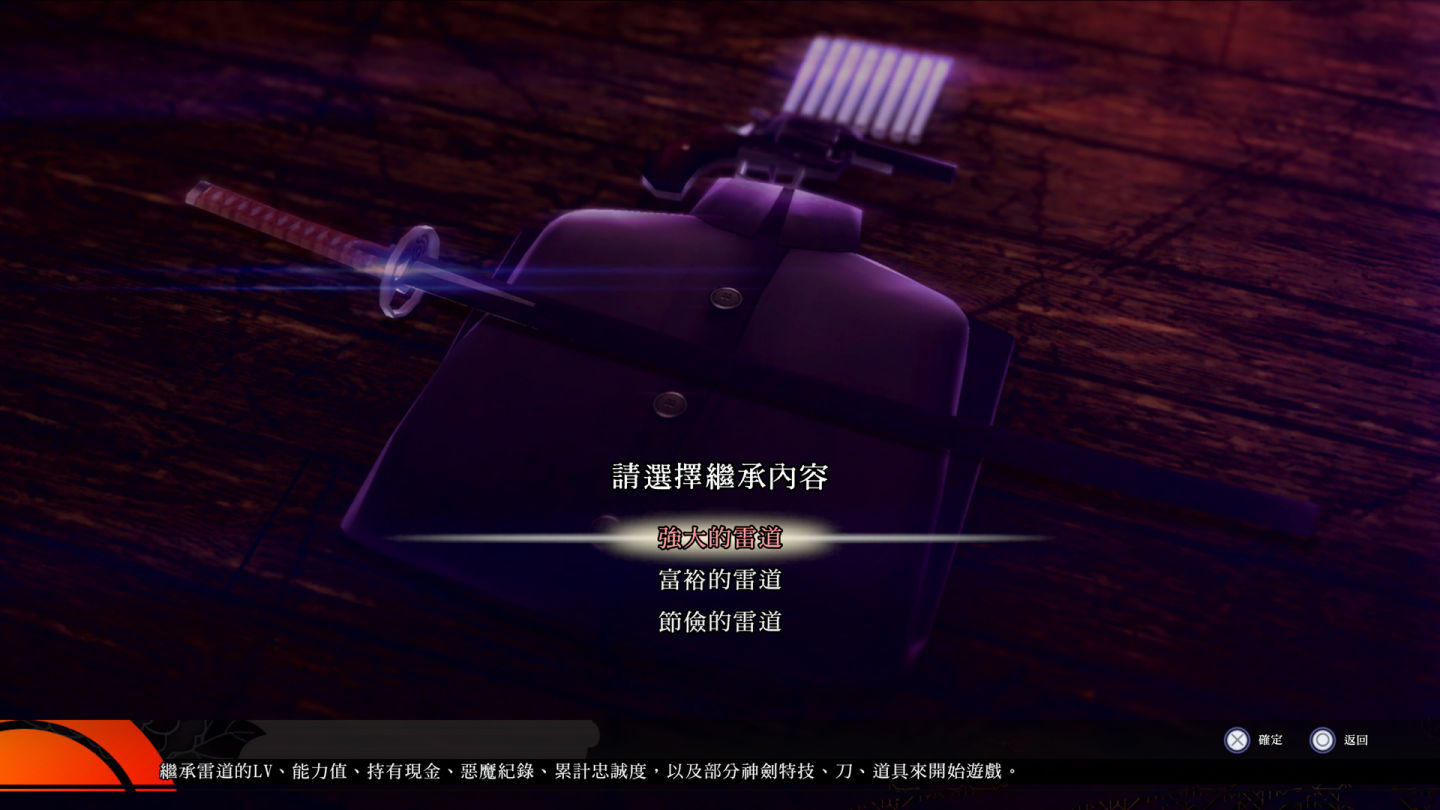 .強大的雷道:選擇後可繼承雷道通關時的等級、能力值、持有現金、惡魔紀錄、累計忠誠度,以及部分神劍特技、刀、道具來開始遊戲。 .富裕的雷道:選擇後可繼承雷道通關時的持有現金、惡魔紀錄、累計忠誠度,以及部分神劍特技、刀、道具來開始遊戲。 .節儉的雷道:選擇後可繼承雷道通關時的惡魔紀錄、累計忠誠度來開始遊戲。 |