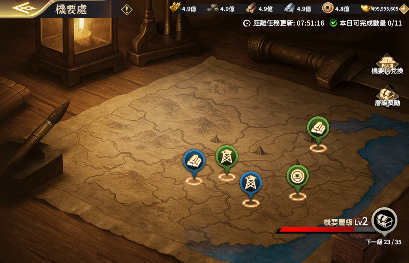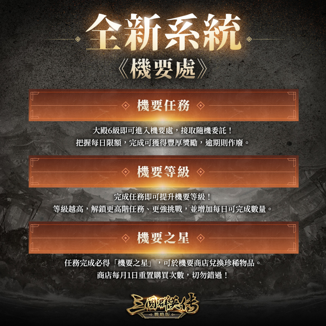 全新玩法「機要處」強勢登場!三國奇遇無處不在,每一日都將迎來全新的挑戰與未知,等待主公勇敢踏上征途!每日皆有不同隨機任務等待完成,不僅能獲得豐厚資源獎勵,更可能意外觸發隱藏的特殊任務,帶來前所未有的驚喜與收穫!在這場風雲詭譎的旅程中,主公的每一步選擇,都是決定命運的關鍵時刻,將引領你踏向屬於自己的傳奇篇章!
