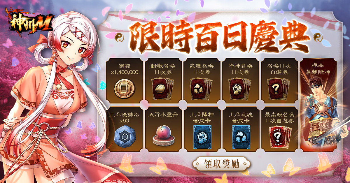 適逢《神州M》上市滿百日,官方同步推出「百日慶典、28 日特別登入」活動。凡於活動期間每日登入,即可獲得強化資源,累積登入更可以直接獲得「五行小靈丹」、「最高級召喚 11 次自選券」與「極品燕起降神」等珍稀遊戲內容!