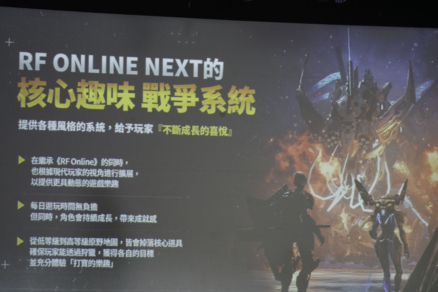 《RF ONLINE NEXT》開發總監PD洪光民提到自己也是一位 MMORPG 的玩家,並表示:「我們準備了包含 PVE、PVP 以及 GVG 在內的多樣化內容。在延續原作《RF Online》傳統的同時,也針對現代玩家的視角進行了擴展,力求帶來更具動態感與深度的全新樂趣。」期望為所有玩家打造出結合懷舊與革新的次世代MMORPG體驗。