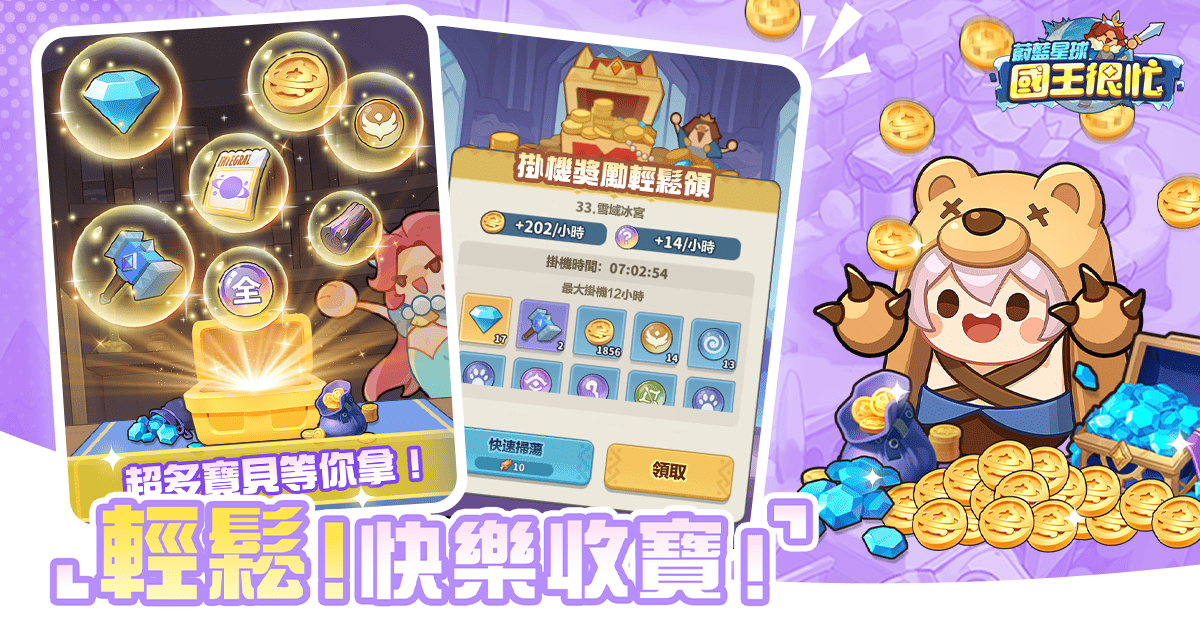 豐富的掛機資源點擊即領,鑽石金幣獎勵、英雄招募券、全職業經驗、超凡寶錘等養成資源應有盡有,英雄養成無負擔,助力各位國王提升戰力,消滅哥布林!