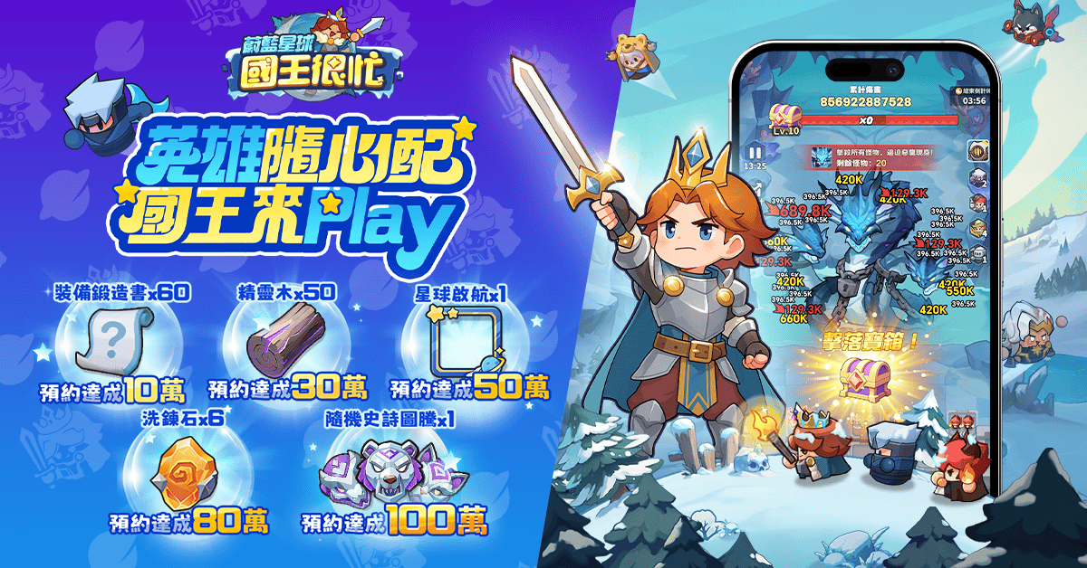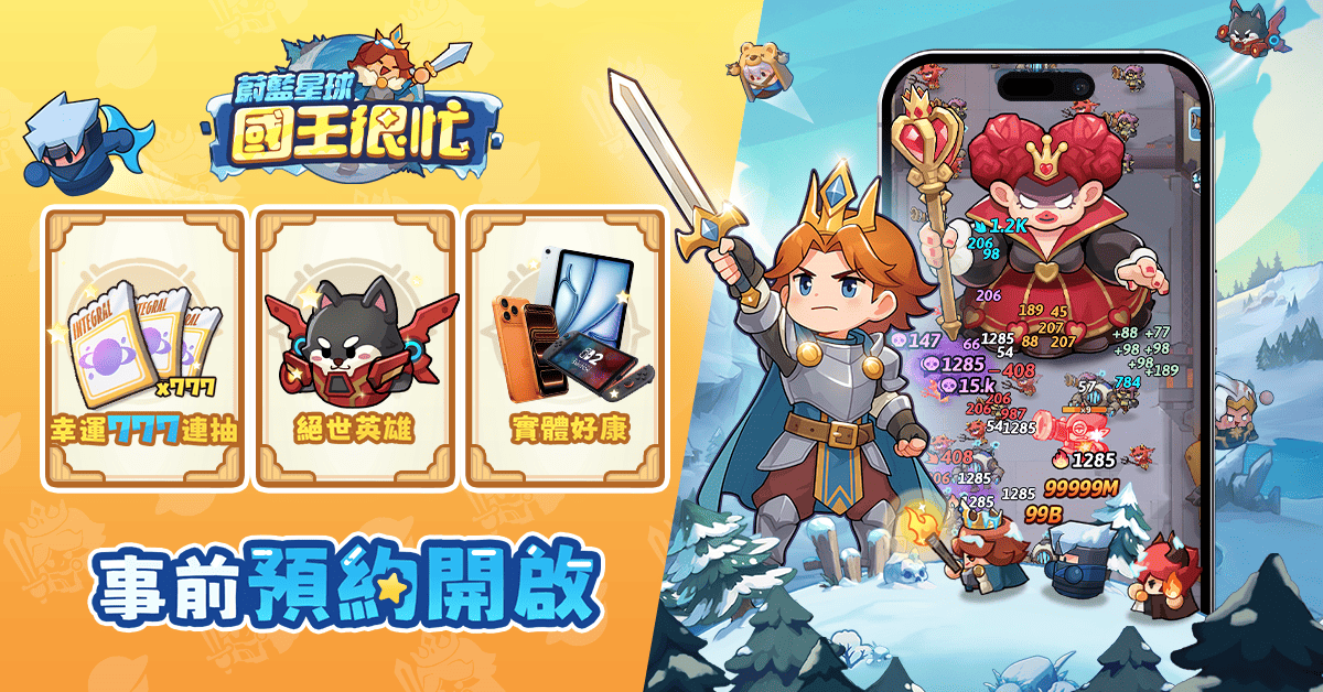 《蔚藍星球:國王很忙》事前登錄活動已正式啟動!成功預約即可在遊戲正式上線後領取豐厚獎勵,包括絕世英雄、幸運 777 連抽、還有 iPhone、iPad Air、Switch 等實體好康等你來拿!隨著各位國王的加入,預約活動將解鎖更多精彩好禮,快邀請親朋好友一同開啟這場奇妙冒險吧!