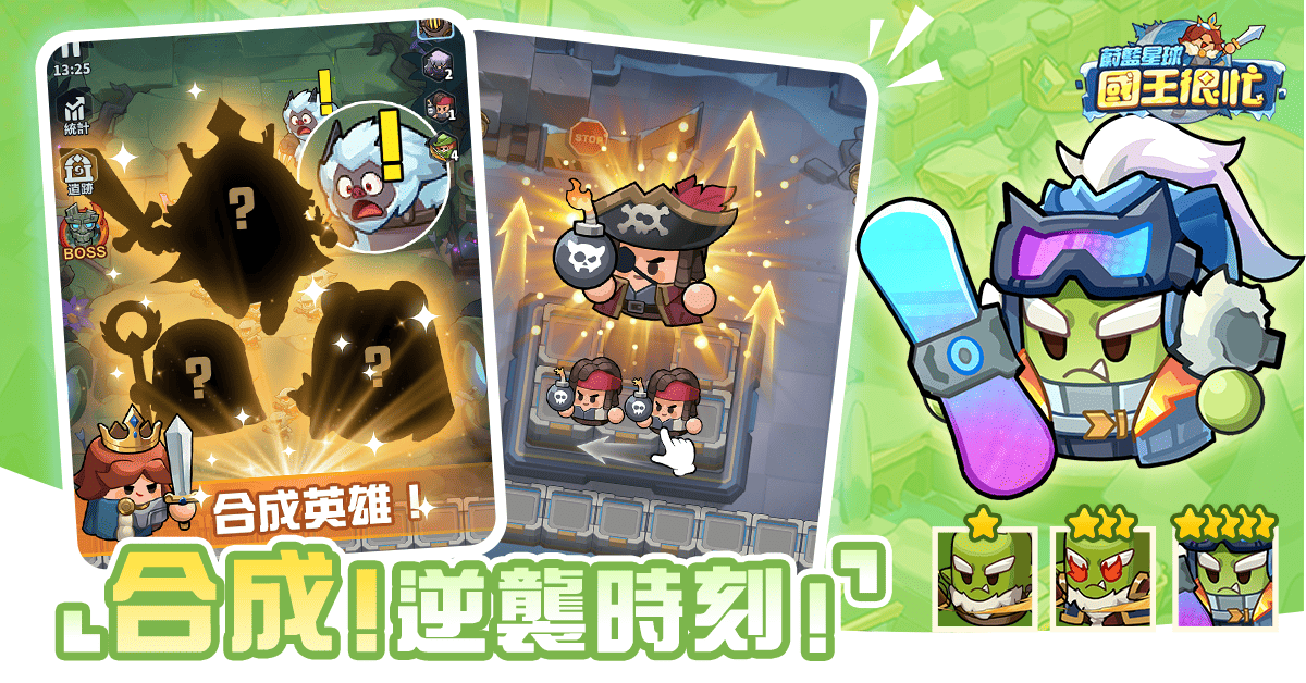 .合合英雄配,天賜幫 Play:英雄可隨機合成更高階形態,連續三次合成還能解鎖隨機強力技能,秒殺全場。