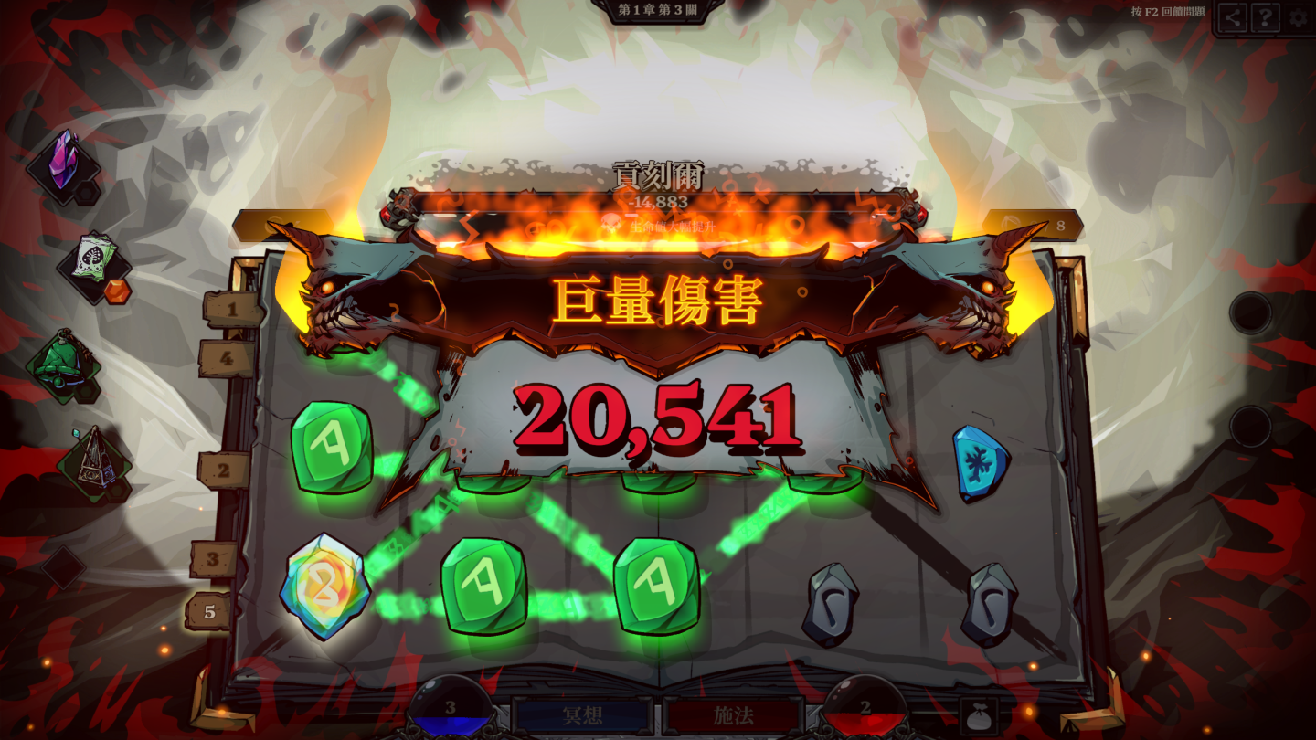 就像操控一台魔法驅動的老虎機。通過保留符文,重新隨機等方式盡可能的連接更多同元素符文,打出高額傷害。每本符文書會有不同的鏈路刻印,處於鏈路節點上的符文更為關鍵,明智選擇每次施法的時機,才能在不斷增強的敵人面前屢戰屢勝。