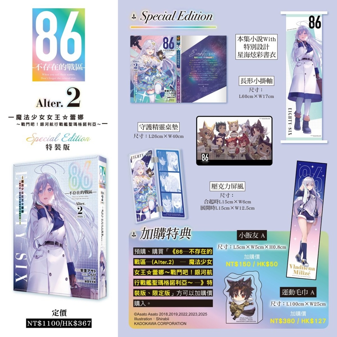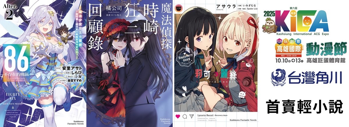 2025高雄國際動漫節即將於 10/10 ~ 10/13 在高雄巨蛋熱鬧登場,台灣角川將與尖端、東販三家聯合參展!今日公開首賣新刊與動漫精品最強陣容──首賣特裝版的部分共推出四部作品,首推日本原作邁入最終篇章的熱門話題作《86─不存在的戰區─(Alter.2) ─ 魔法少女女王☆蕾娜~戰鬥吧!銀河航行戰艦聖瑪格諾利亞~ ─》收錄多篇未發表短篇,動畫化超人氣作品首次短篇集系列、《約會大作戰》外傳推理小說《魔法偵探時崎狂三回顧錄》、守護日常的少女特務外傳續篇《Lycoris Recoil 莉可麗絲 Recovery days》以及日本知名耽美漫畫家スカーレット・ベリ子首部全彩條漫話題作續篇《救贖:唯一的永遠 2》。