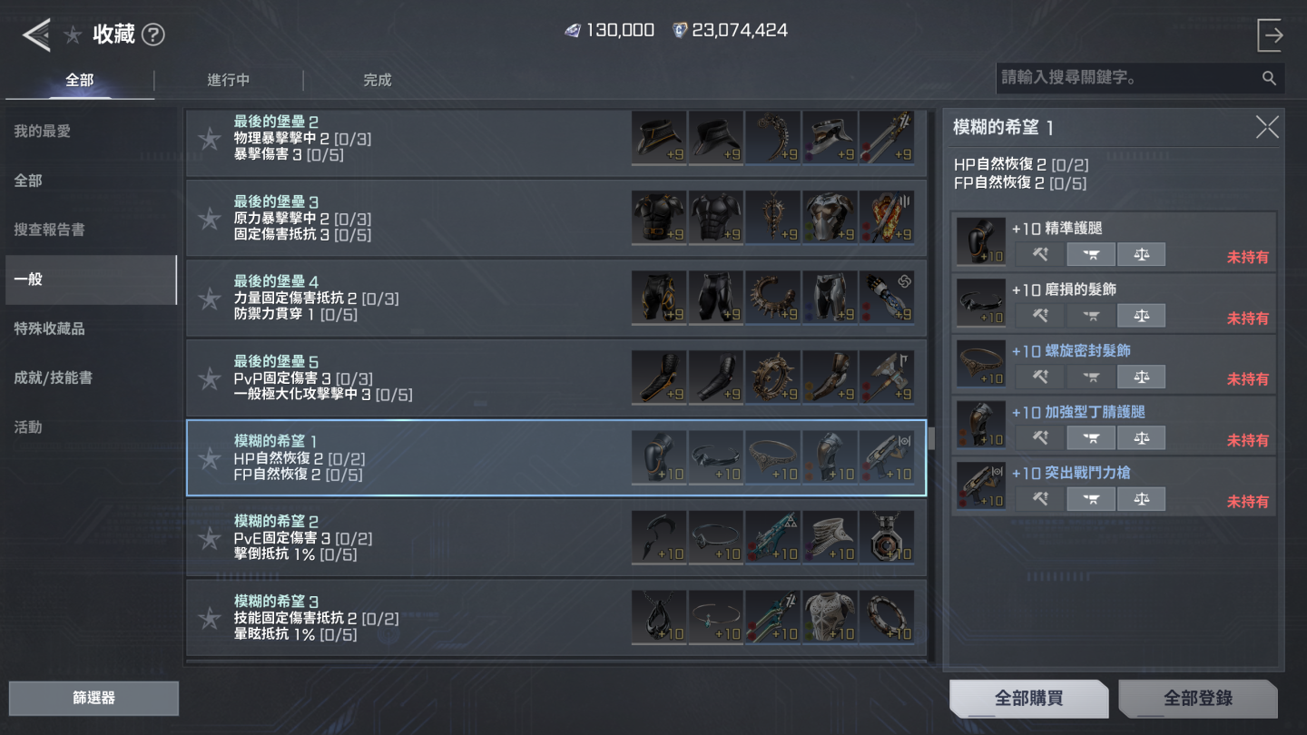 遊戲中收藏的範圍非常多樣化,因此基本汰換下來的裝備不太會有「沒用」的狀況出現,從基礎+0、過渡期的+5、+7裝備,甚至到較為高階的「首要」前墜裝備,都會有收藏格需要他;除此之外,地圖探索也會獲得「特殊收藏品」、「成就」、「技能書」等道具提升收藏內容,並且藉此提升角色的各項素質,如果是用打造或是購買管道加速解鎖收藏圖鑑的話,筆者個人建議首先以FP增加、暴擊相關、傷害增加率為首要目標。