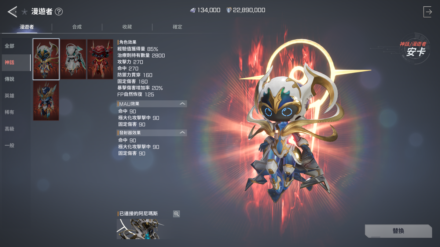 抽卡部分除了生化戰甲之外,當然不能忘了RPG作品中最重要的夥伴元素,這可是會時刻陪伴在角色周圍的小夥伴,和生化戰甲的分級制度、合成都相同,唯一的區別是漫遊者並沒有限制職業使用,只有在提供角色效果、MAU效果、發射器效果上做出區別。