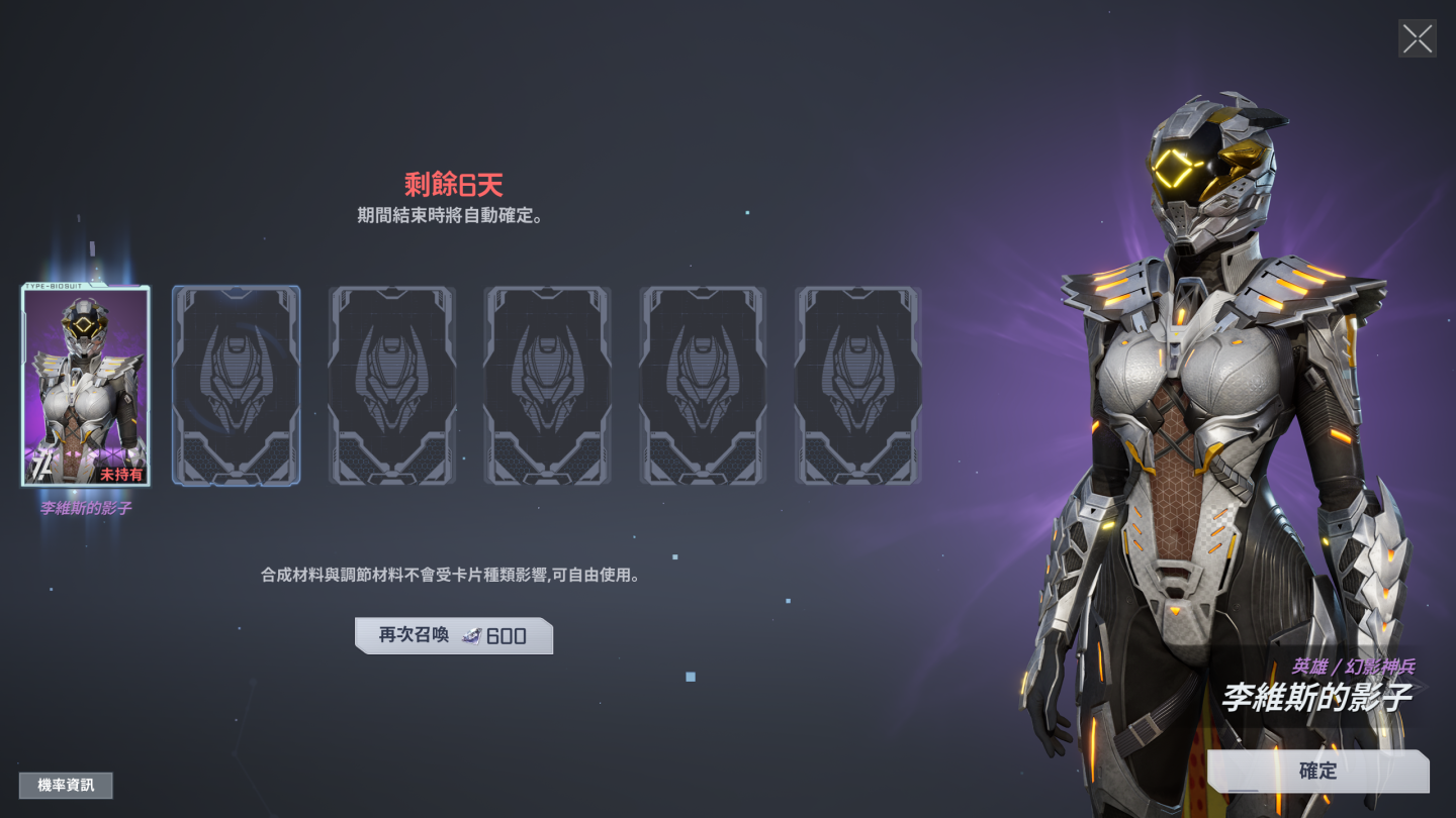 雖然同階生化戰甲的屬性差距並不大,但如果是有特別想要某款生化戰甲的造型,或是抽到的生化戰甲並非自己想要玩的職業,在抽到英雄以上階級的生化戰甲時,選定前也能夠透過再次召喚,隨機換成同一階級的其他生化戰甲,每次獲得新生化戰甲都會有五次的再次召喚機會,但要注意的是「每次召喚都會讓再次召喚的費用變高」,因此筆者其實不推薦大家死嗑某一台生化戰甲,因為將鑽石花在購買強化道具,或是抽更多不同機甲所帶來的提升會更高一些。
