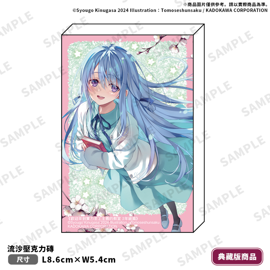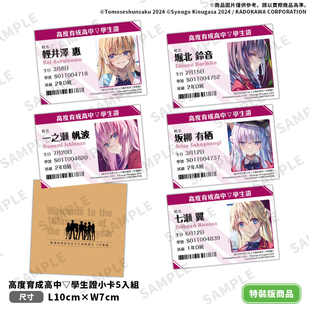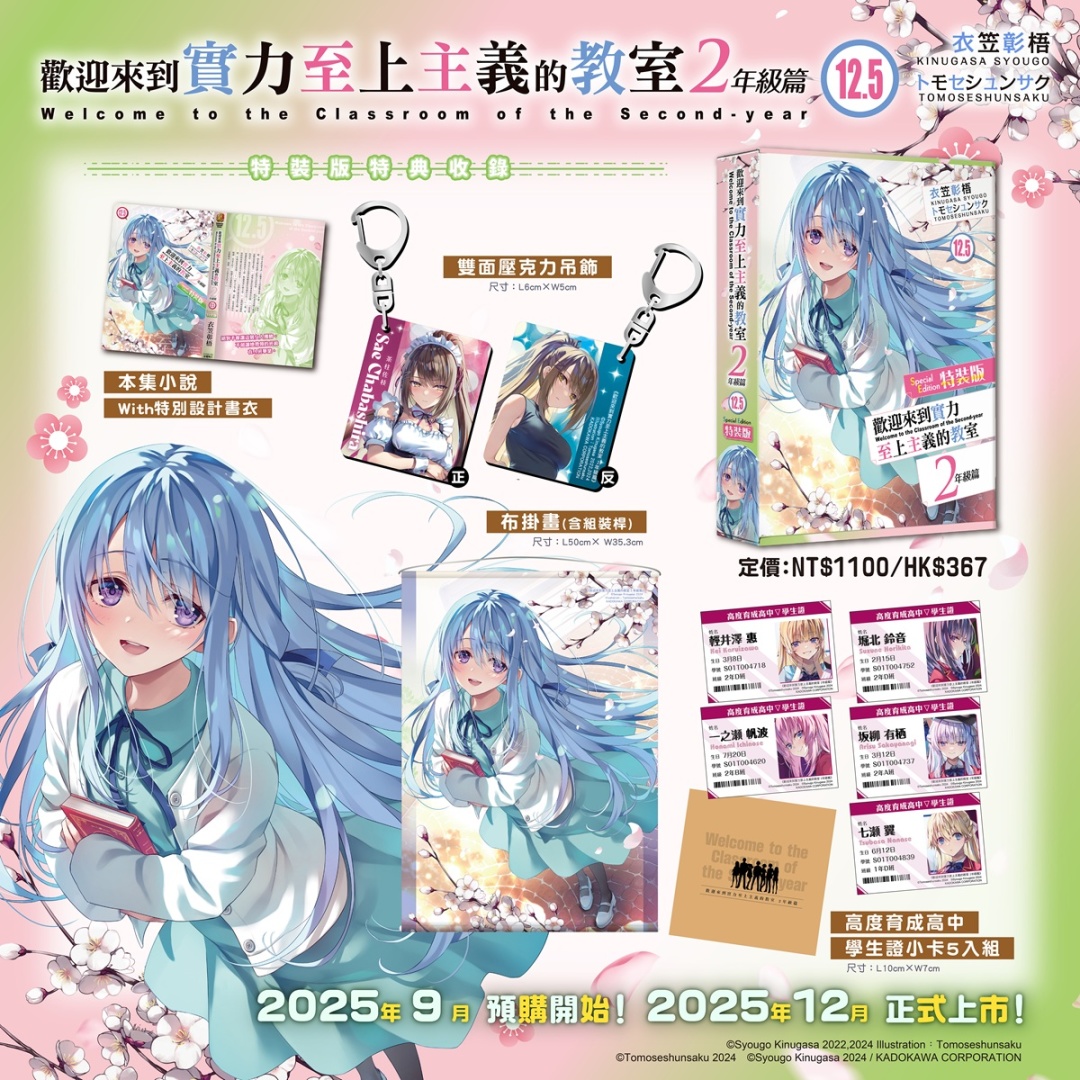而特裝版收錄特典:雙面不同服裝的茶柱佐枝「雙面壓克力吊飾」、與封面同款椎名日和「布掛畫(含組裝桿)」以及仿真校園風格的「高度育成高中▽學生證小卡 5 入組」,為 2 年級系列最終章獻上誠意滿滿的收藏組合。兩款皆可於全通路進行限期預購至 10/3(五),於台灣角川官網完成預購再加碼贈送購物金 100 元。