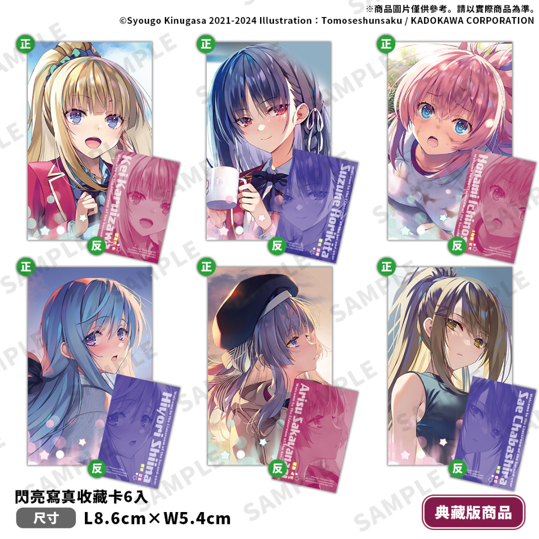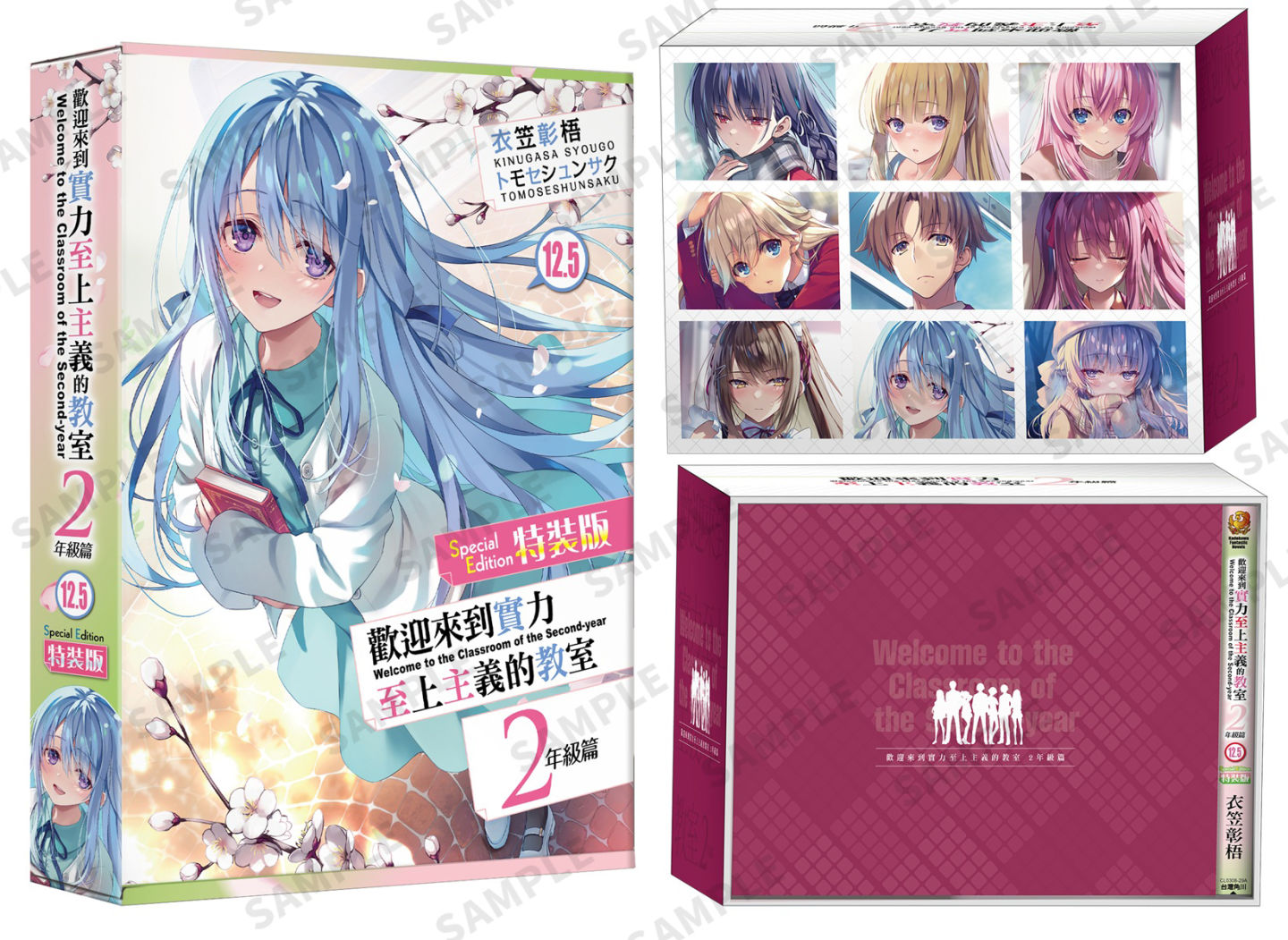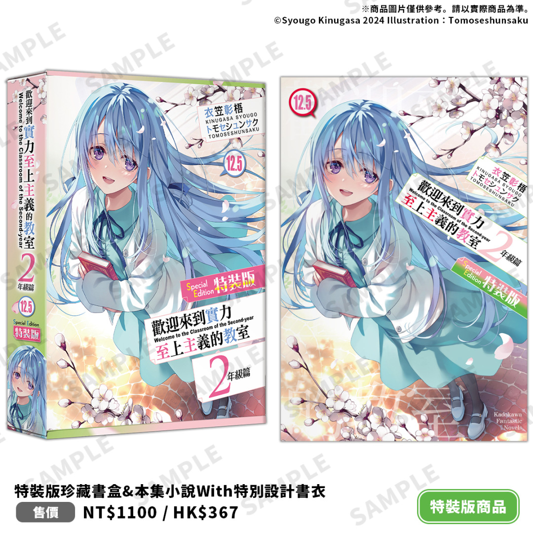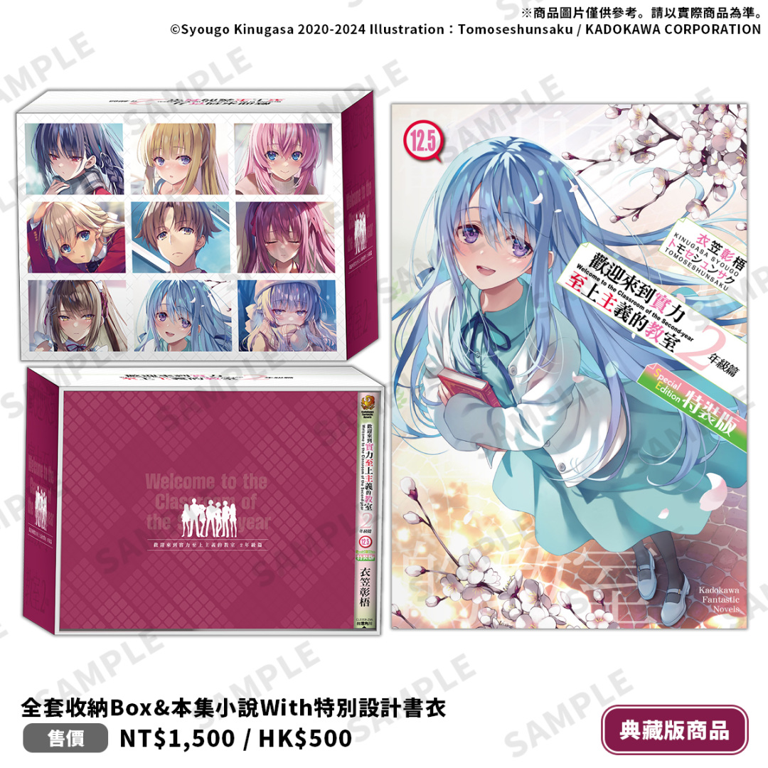 《歡迎來到實力至上主義的教室 2年級篇 (12.5)》特別規劃全套收納 Box 典藏版&特裝版兩種版本,皆包含本集小說 with 特別設計書衣。全套收納 Box 典藏版收錄特典:療癒養眼的七瀨翼「胖胖午安枕」、彷彿置身於春櫻飄落的椎名日和「流沙壓克力磚」、各別人氣角色的「閃亮寫真收藏卡 6 入」,並附上可收納全系列小說的「全套收納 Box」,箱體有著眾角色構圖設計,極具紀念價值。