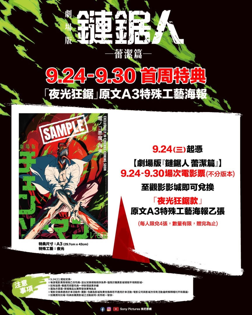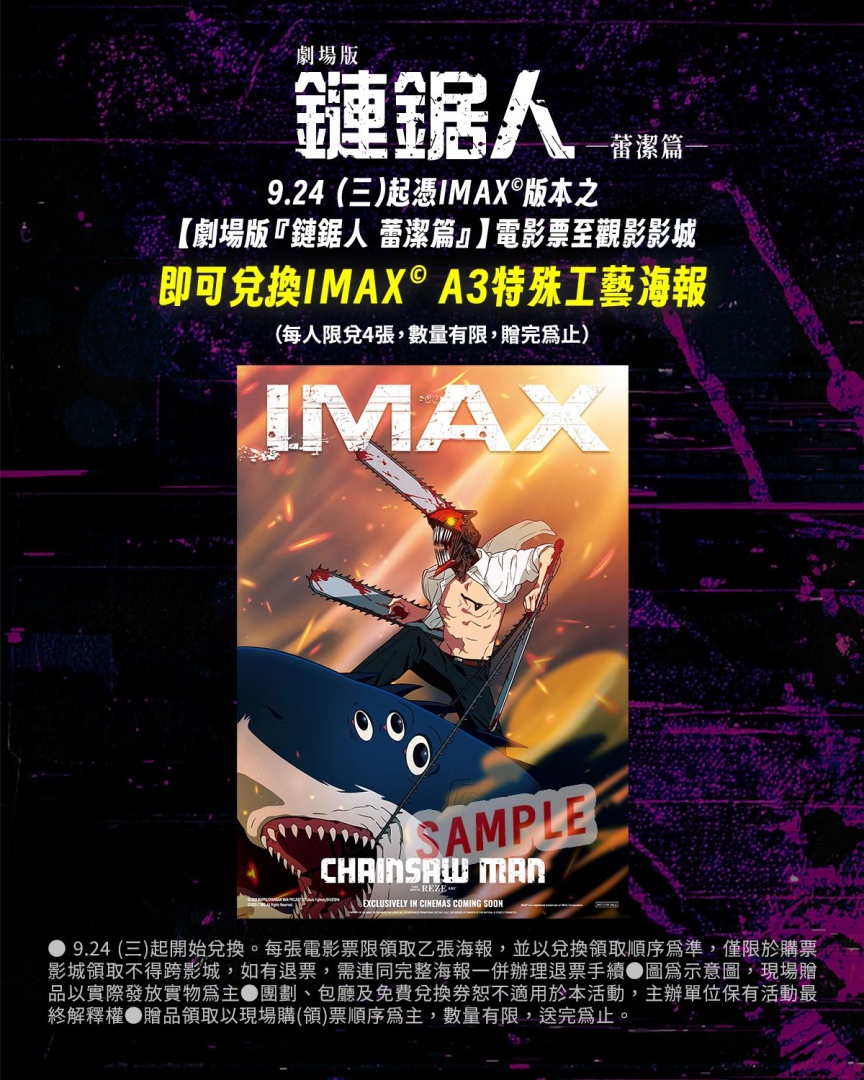 《劇場版『鏈鋸人蕾潔篇』》上映首週也持續推出限量獨家特典,從 9 月 24 日起,不分版本電影票即可於觀影影城兌換「夜光狂鋸款」原文 A3 特殊工藝海報乙張,購買 IMAX 電影票的觀眾更可再兌換「IMAX限定特殊工藝海報」乙張,絕美的海報勢必又將再掀起搶購熱潮。
