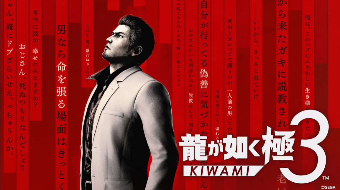 根據人中之龍工作室代表.製作總指揮「橫山昌義」表示,「隨著系列將於今年 12 月 8 日迎來 20 週年紀念,今天也為玩家們帶來《人中之龍 極3》的最新曝光。這次的《人中之龍 極3》,為完全重製作品,不只畫質全面更新,系統與演員也有很大的重製。