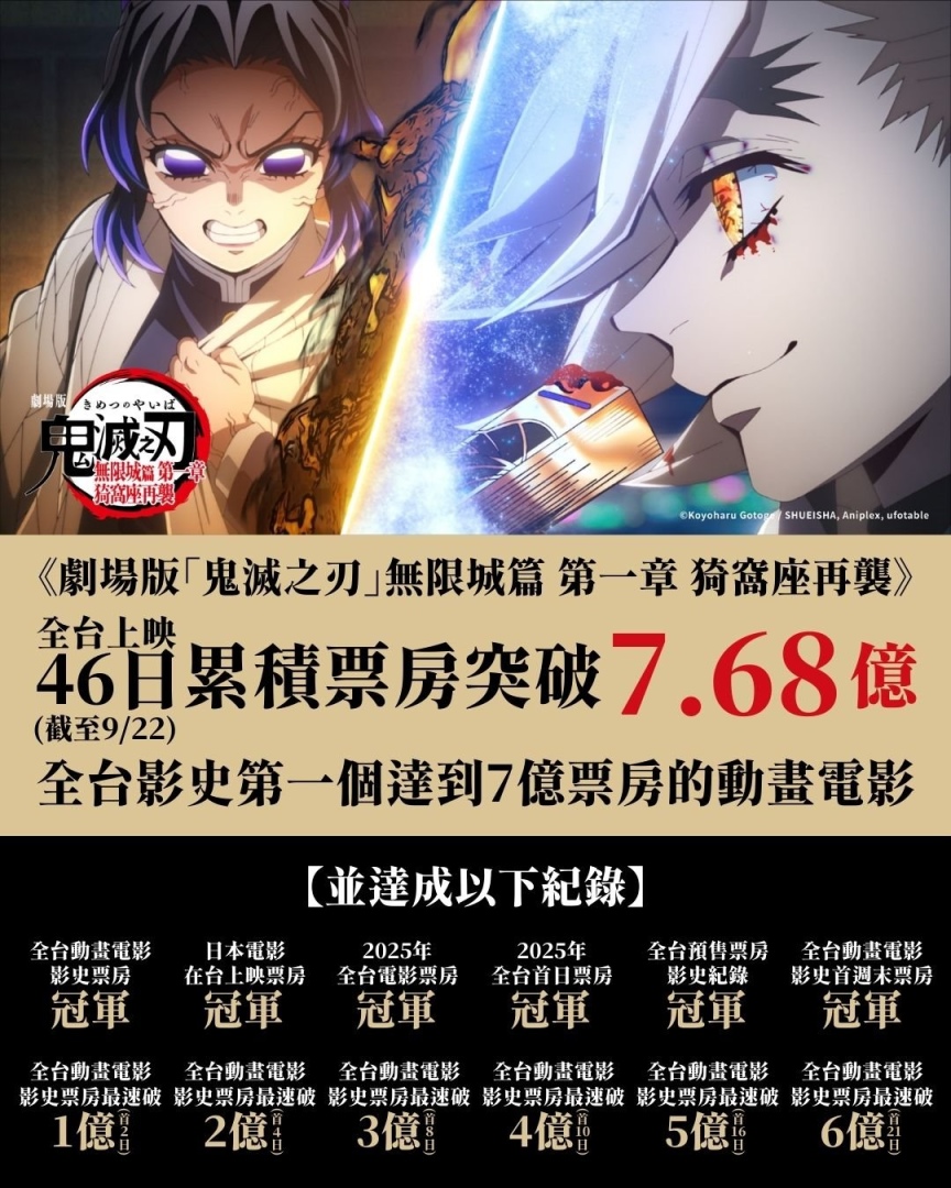 《劇場版「鬼滅之刃」無限城篇 第一章 猗窩座再襲》自 8 月 8 日正式在台灣上映以來,在全台掀起熱潮,而票房截至昨日票房突破 7.68 億新台幣,同時在台灣電影票房排行榜上位列第六名的成績。