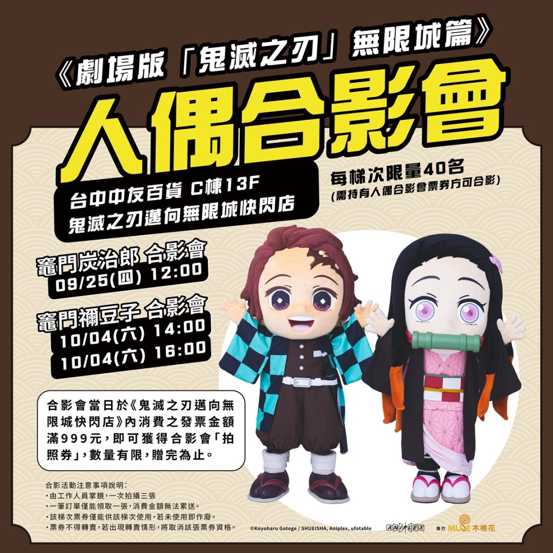 活動期間更規劃限定人偶合影會,9 月 25 日由「炭治郎」率先登場,10 月 4 日則由「禰豆子」接棒亮相舉辦兩日共三場的人偶合影會。凡於當日購買快閃店商品滿 999 元,即可獲得合影資格,每梯次限量 40 名,粉絲千萬別錯過與人氣角色近距離互動的難得機會。