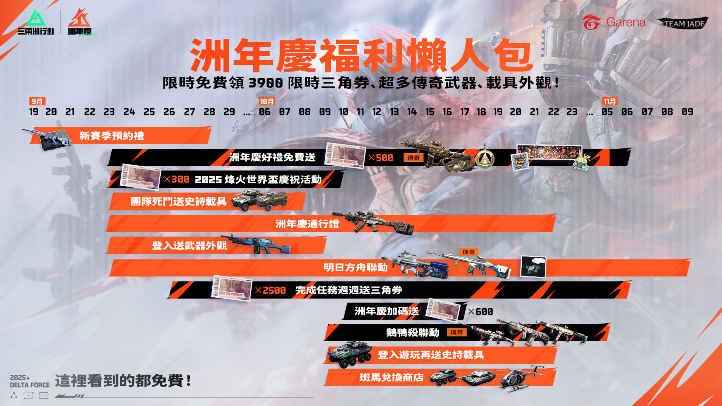 為慶祝全新賽季登場及遊戲即將迎來一週年里程碑,《Garena 三角洲行動》特別推出一系列「洲年慶」重磅慶祝活動。玩家將可免費獲得高達 3,900 張三角券(總價值超過新台幣 9,000 元)、14 款武器外觀、7 款載具外觀等豪華獎勵,並包含多項獨家跨界 IP 聯動內容。官方同時宣布,本次豐厚回饋將一路延續至十月底,更多驚喜內容即將揭曉,敬請玩家拭目以待。