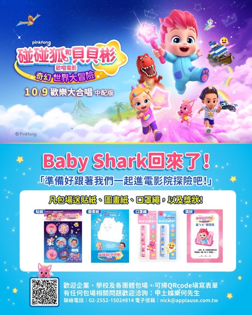 全球破百億點擊神曲〈Baby Shark〉與無數經典兒歌的「兒童界人氣巨星」貝貝彬與碰碰狐,首度登上大銀幕,全新奇幻冒險動畫《碰碰狐和貝貝彬歡唱電影:奇幻世界大冒險》將於 10 月 9 日在台上映!故事描述貝貝彬在玩躲貓貓時意外被吸進平板電腦,哥哥布羅迪與姊姊寶拉只能聯手碰碰狐,在電量耗盡前展開緊急救援!2D、3D結合打造繽紛世界,恐龍、賽車、獨角獸等驚喜角色輪番登場,帶來滿滿冒險與歡笑。