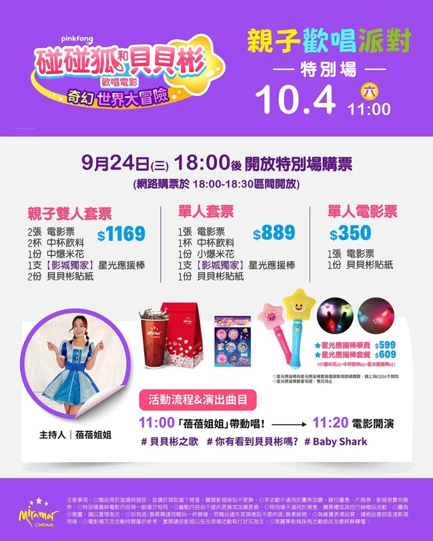 美麗華影城限定的「親子歡唱派對特別場」,將於 9 月 24 日晚間六點開放購票,爸爸媽媽不妨把握機會,帶著寶貝們一起體驗人生第一次的電影院冒險,讓笑聲與歌聲隨著大銀幕綻放。喜愛碰碰狐與貝貝彬的大小觀眾,更是不要錯過這場屬於親子同樂的奇幻大冒險!立即購票,和孩子一起準備好星光應援棒,跟著蓓蓓姐姐盡情歌舞,在大銀幕上開啟屬於全家的快樂旅程吧!