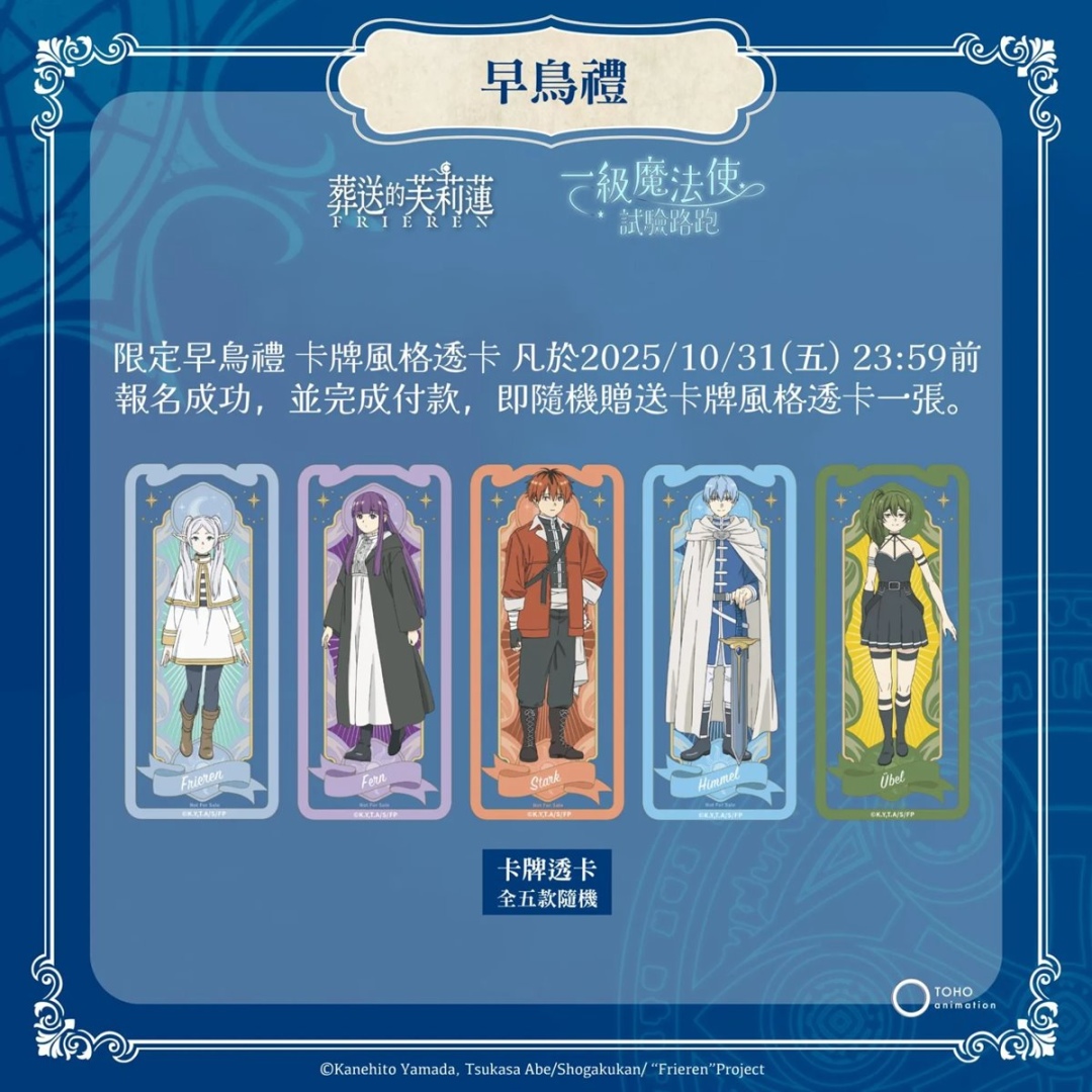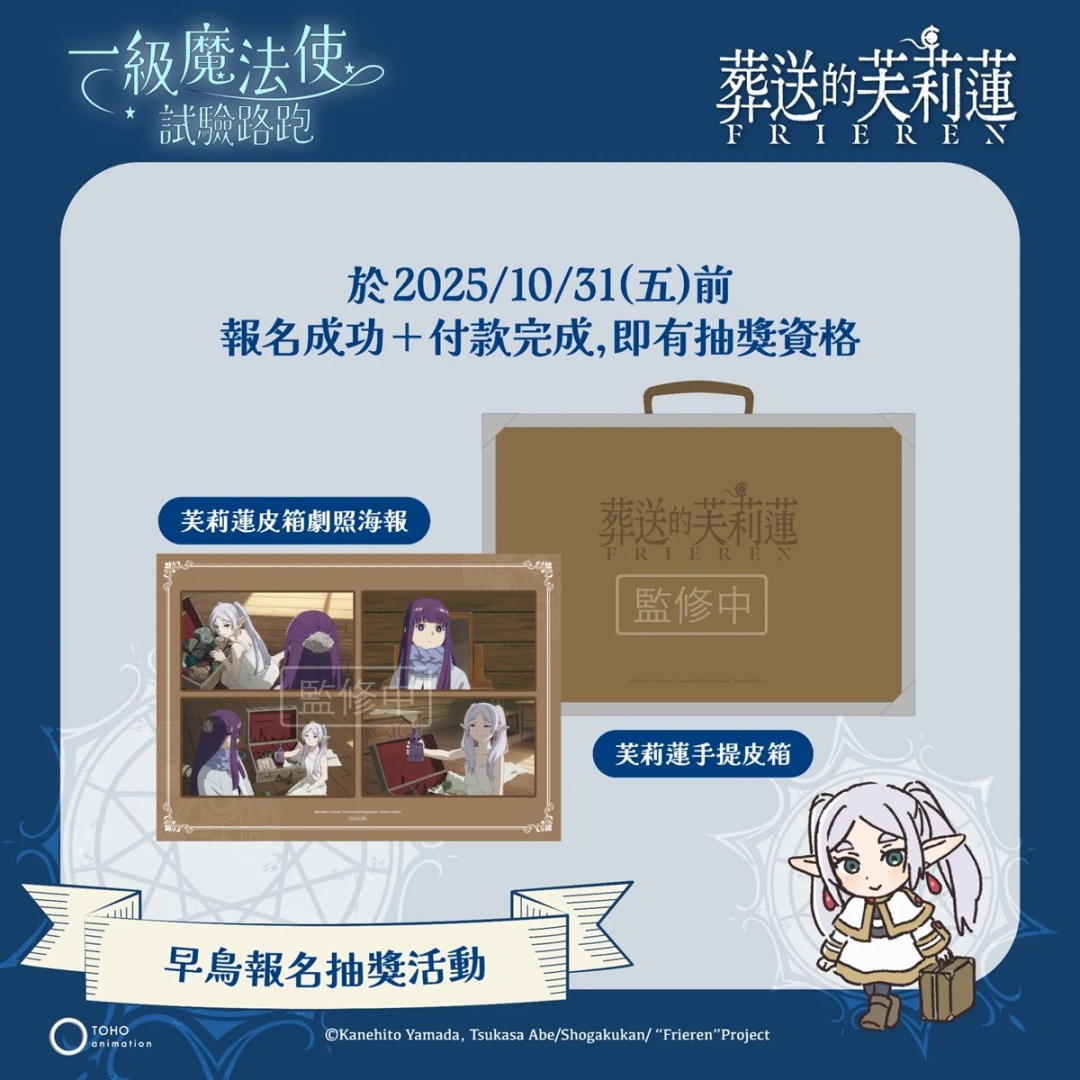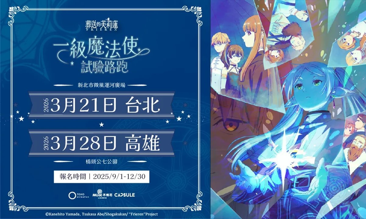 喜愛《葬送的芙莉蓮》的粉絲們注意!CAPSULE 主辦的「一級魔法使試驗路跑」將於 2026 年 3 月在台北與高雄盛大開跑!即日起開放報名,凡於 2025 年 10 月 31 日(五)23:59 前完成報名並付款,即享早鳥優惠,不僅能獲得限定「卡牌風格透卡」(全五款隨機),還有機會抽中限量「芙莉蓮手提皮箱」!