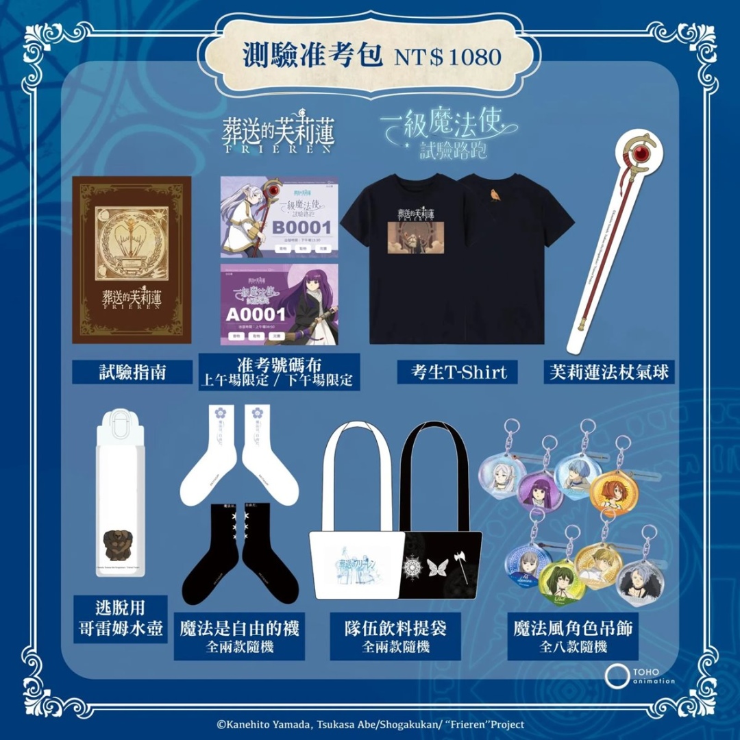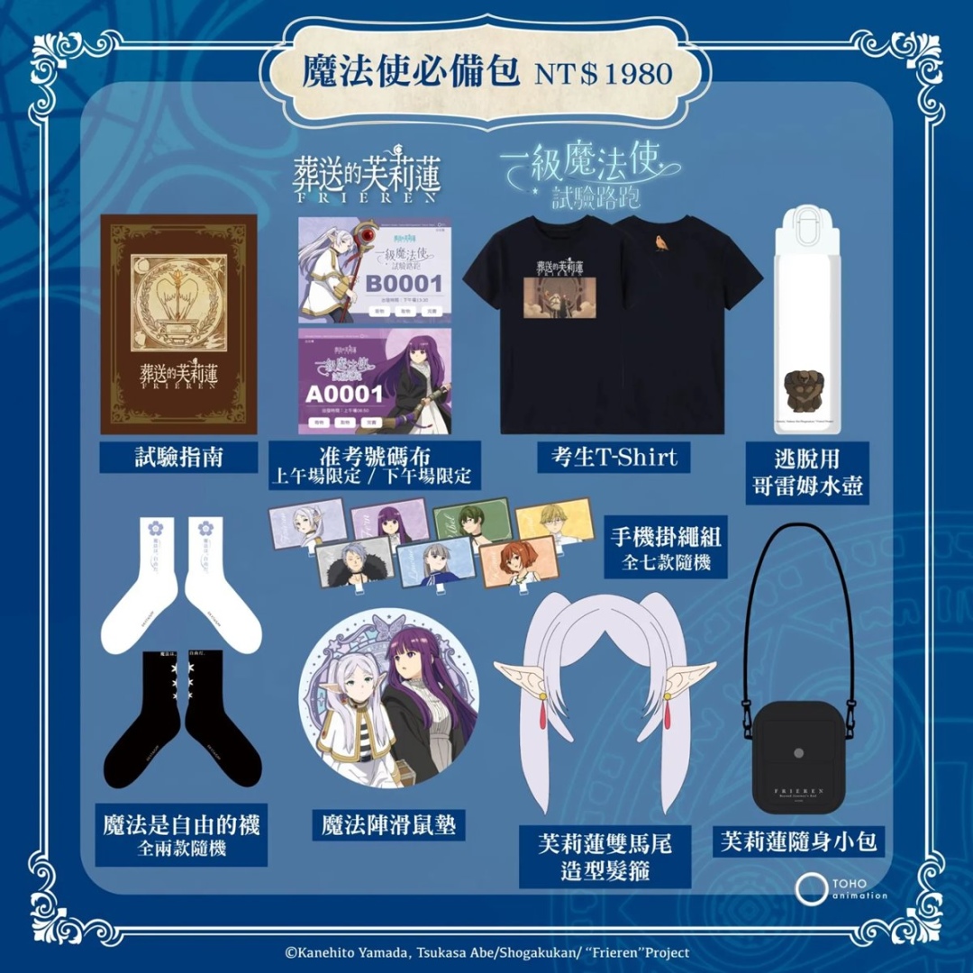 內含試驗指南、准考號碼布、考生 T-Shirt、芙莉蓮法杖氣球、水壺、襪子、飲料提袋與魔法風角色吊飾(全八款隨機)等多項實用周邊。
