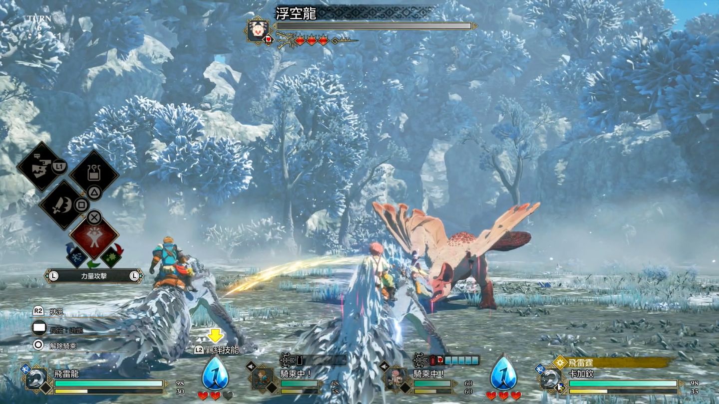 由於在騎乘狀態下,玩家可使用隨行獸的吐息或近戰攻擊擊中野外魔物,若成功命中,便能在戰鬥開始時獲得有利的先機。這些騎乘動作也能應用於巨大採集點等場景。