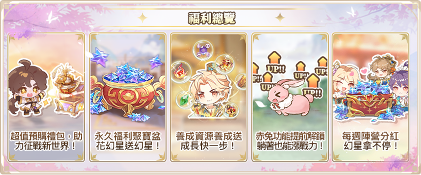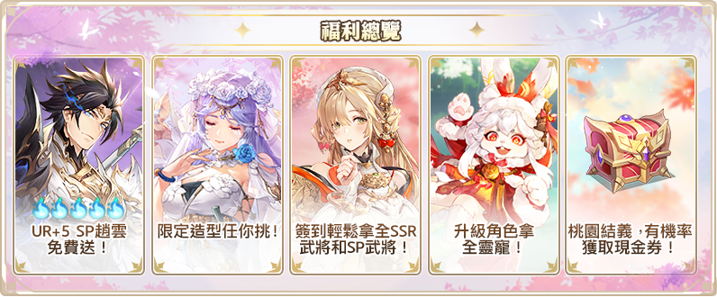 新世界服正式開啟!進入新服的城主們簽到即可享好禮!週一至週六送 SSR 武將,週日還送 SP 武將,讓你全圖鑑武將都可以輕鬆拿到!另外還有超值預購禮包、永久福利聚寶盆以及花幻星送幻星,助你徵戰新世界!