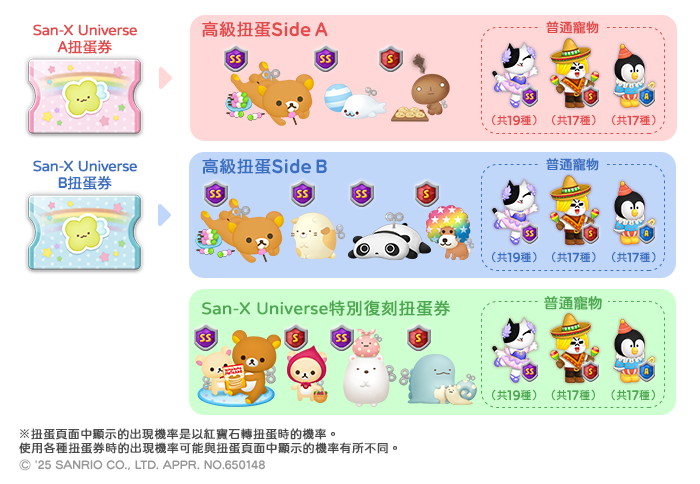「三色糰子拉拉熊」、「貓(磨爪)」、「Mamegoma」、「烤煎餅」、「趴趴熊」和「阿福羅」都將化身為「合作活動限定寵物」在高級扭蛋中登場!透過達成遊戲中各種合作活動任務獲得的「San-X Universe A扭蛋券」或「San-X Universe B扭蛋券」可用來轉高級扭蛋!快把握機會讓「San-X Universe」角色們成為你的過關夥伴,一起在遊戲中闖關吧!