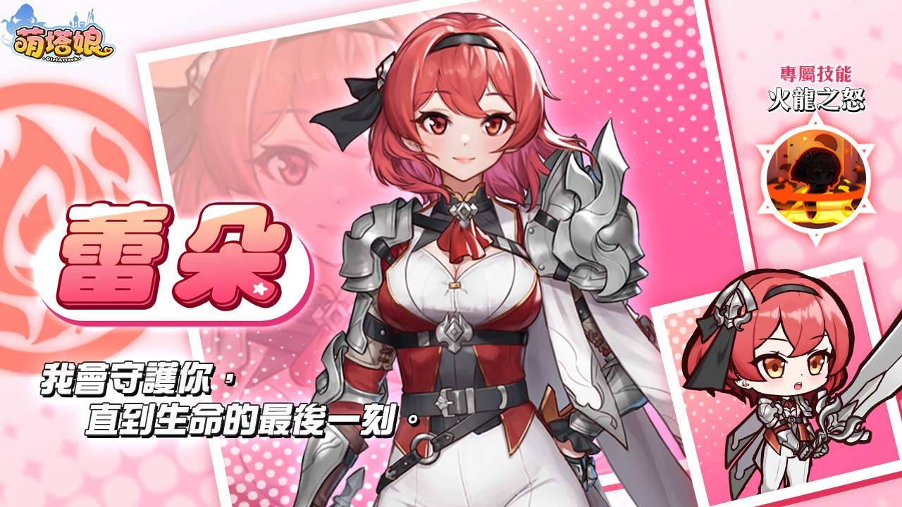 蕾朵繼承了母親火龍後裔的血脈,她熾紅如焰的髮絲與瞳孔,註定她是一位能夠馭控火焰的強大戰士,也是騎士團中最穩定的攻擊核心。蕾朵的專屬技能「火龍之怒」能持續的釋放出炙熱烈焰,將敵人吞沒在火焰洪流之中。在騎士團隊伍中,適合安排在前方第一線的作戰位置,她的存在就如同一面火焰之盾,無論前方有多險惡的戰場,蕾朵總會是那一個挺身而出的勇者。