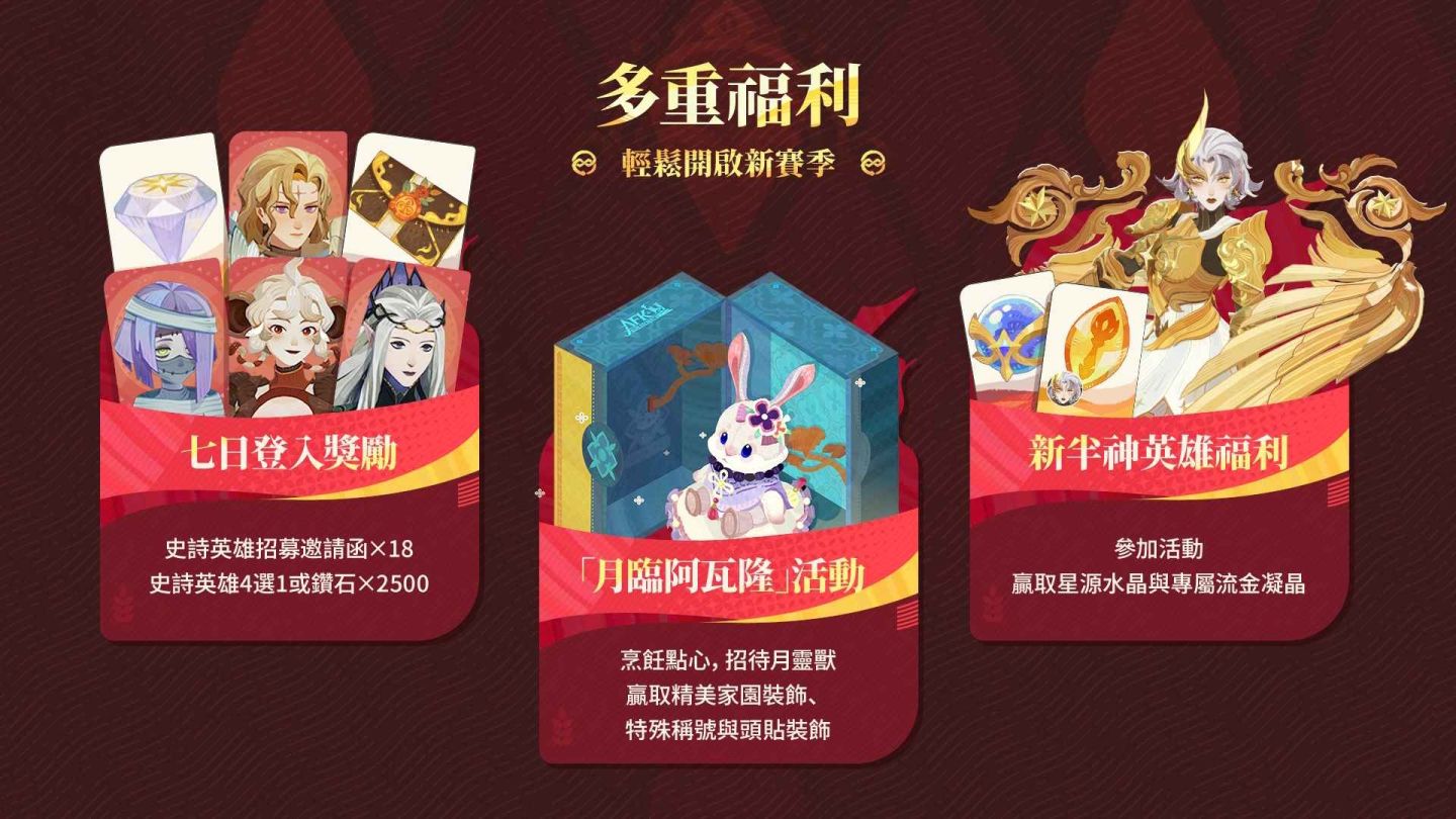 為了迎接新賽季的到來,梅林大人們將獲得前所未有的豐厚回饋。只要在活動期間持續登入,即可逐日解鎖史詩英雄招募券,而累積七日更能抱回史詩英雄自選箱好禮。除此之外,官方還準備了多組特典兌換碼,給梅林大人迎接新賽季的大量好禮: